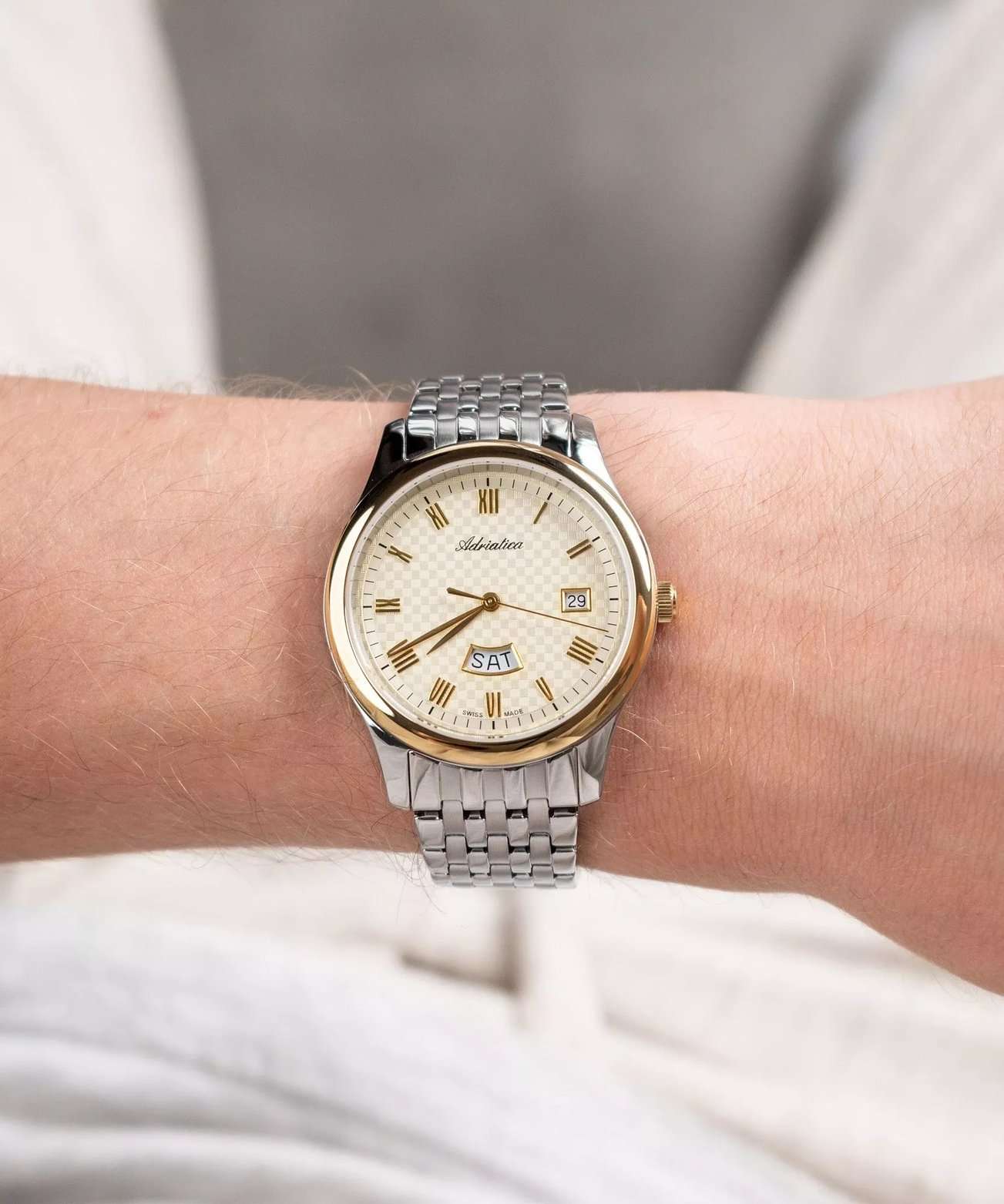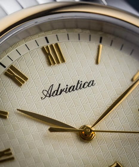 Часы Adriatica A1025.2161Q представляют собой идеальное сочетание элегантности и функциональности, разработанное для современных мужчин. Их стильный циферблат защищен сапфировым стекломСапфировое стеклоПрочный и надёжный материал из кристалла сапфира синтетического происхождения, характеризующийся особой твёрдостью и устойчивостью к царапинам и повреждениям., что придает дополнительную устойчивость к царапинам. Корпус из нержавеющей стали подчеркивает их изысканность и долговечность. Надежный кварцевый механизм с калибром RONDA 517 гарантирует точность времени, а водозащита WR 50 (5 ATM) обеспечивает защиту от воды в различных условиях. Браслет из нержавеющей стали  с раскладной застёжкойРаскладная застёжкаТакой тип застёжки используется только на браслетах из металла. Она никогда не раскрывается полностью, происходит разделение на 2 и более частей. Раскладывающая застёжка снизит вероятность потери часов к минимуму., гармонично дополняет общий дизайн и обеспечивает комфортное ношение на запястье. Окошко даты находится в положении 3 часа. День недели отображается в положении 6 часов. БезельБезельВнешний ободок, закрепляющий стекло. В спортивных часах так называется поворотное кольцо с делениями на циферблате, выполняет роль таймера – замеряет отрезки времени на шкале. Неподвижный безель – элемент декора. Однонаправленно вращающийся безель на дайверских часах позволяет фиксировать моменты погружения и выныривания на поверхность. с PVD-покрытиемPVDУльтратонкое покрытие наносится в технике вакуумного напыления, сочетает в себе нитрид титана особой прочности со слоем золота или оксида хрома. Несёт в себе декоративную или защитную функцию..