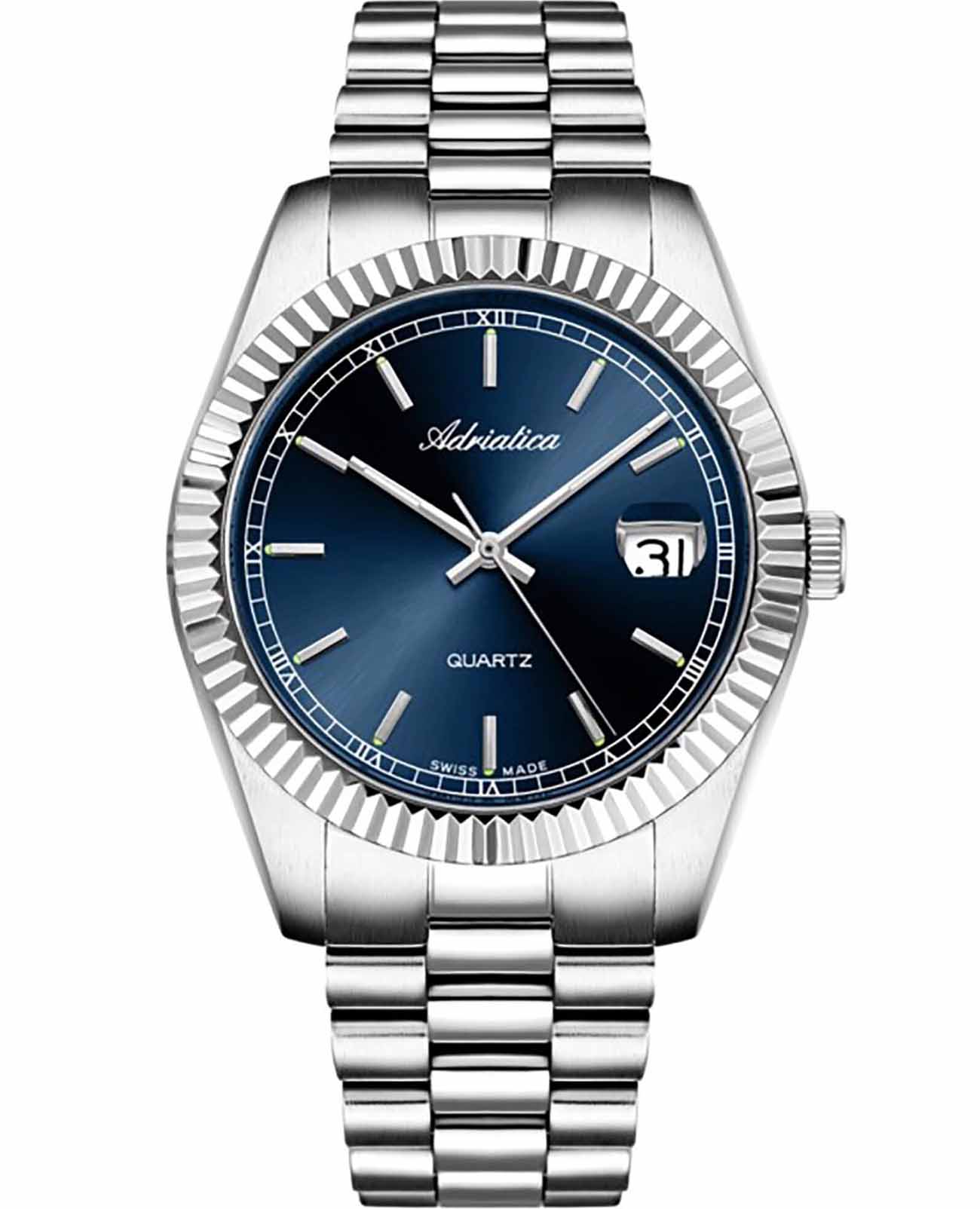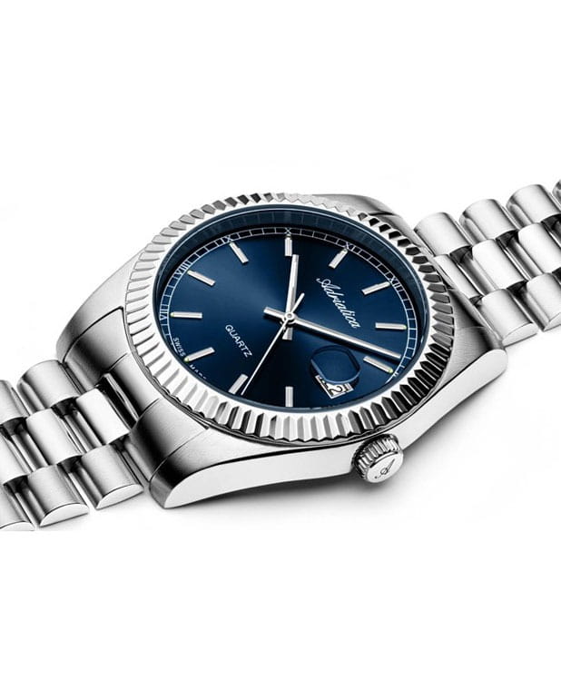 Часы Adriatica A1090.5115Q воплощают в себе классический стиль и надежность, идеально подходящие для современных мужчин. Их синий циферблат, защищенный минеральным стекломМинеральное стеклоМинеральное стекло представляет собой искусственно выращенный минерал кварца. Такое стекло отличается особой устойчивостью к повреждениям и царапинам. Уступает по некоторым качествам сапфировому стеклу., заключен в корпус из прочной нержавеющей стали. Надежный кварцевый механизм с калибром RONDA 515 обеспечивает точность, а водозащита уровня WR 50 (5 ATM) делает их устойчивыми к воздействию воды. Стальной браслет с раскладной застёжкойРаскладная застёжкаТакой тип застёжки используется только на браслетах из металла. Она никогда не раскрывается полностью, происходит разделение на 2 и более частей. Раскладывающая застёжка снизит вероятность потери часов к минимуму. подчеркивает элегантный стиль и комфортно сидит на запястье. Часы оснащены функцией отображения даты в окошке в положении 3 часа, что добавляет практичности в повседневной жизни. Люминесцентное покрытиеЛюминесцентное покрытиеПозволяет считывать показания времени в темноте. Производители наносят на стрелки, часовые индексы, безель или поверхность циферблата светонакопительный состав, дающий холодное свечение. на стрелках и метках обеспечивает отличную видимость в темноте.