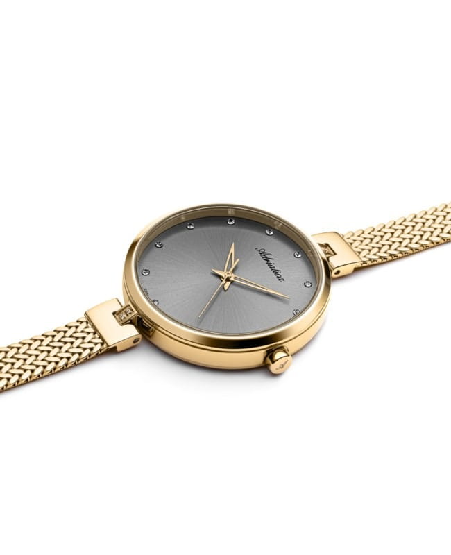 Изысканные женские часы Adriatica A3819.1147Q, произведенные в Швейцарии. Эти часы идеально подойдут для женщин, ценящих элегантность и стиль. Часы оснащены надежным кварцевым механизмом Ronda 763, обеспечивающим точность и долговечность. Корпус диаметром 34 мм и толщиной 7 мм выполнен из стали с PVDPVDУльтратонкое покрытие наносится в технике вакуумного напыления, сочетает в себе нитрид титана особой прочности со слоем золота или оксида хрома. Несёт в себе декоративную или защитную функцию. покрытием, что придает часам современный и утонченный вид. Серый циферблат, украшенный кристаллами, придает дополнительное сияние и изысканность. Минеральное стеклоМинеральное стеклоМинеральное стекло представляет собой искусственно выращенный минерал кварца. Такое стекло отличается особой устойчивостью к повреждениям и царапинам. Уступает по некоторым качествам сапфировому стеклу. защищает циферблат от повреждений, а водозащита уровня 30WR позволяет использовать часы в условиях легкой влажности. Стальной браслет с PVDPVDУльтратонкое покрытие наносится в технике вакуумного напыления, сочетает в себе нитрид титана особой прочности со слоем золота или оксида хрома. Несёт в себе декоративную или защитную функцию. покрытием золотистого цвета и раскладным замкомРаскладной замокДанный вариант застежки используется только на часах с металлическим браслетом. Отличительная особенность такого крепления в том, что длина браслета становится универсальной и вы можете самостоятельно отрегулировать нужный вам размер – застежка просто двигается по браслету часов. обеспечивает комфортное ношение и надежную фиксацию на запястье.