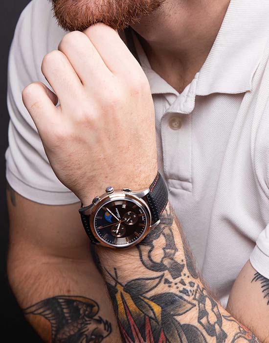 Кварцевые часы работают от батарейки или аккумулятора. Внутри механизма установлен кристалл кварца: под воздействием электричества он колеблется с очень стабильной частотой, а электроника превращает эти колебания в секунды и управляет стрелками. Такие часы ценят за точность и простоту. Средняя погрешность — около ±15 секунд в месяц, поэтому время долго остаётся практически идеальным.