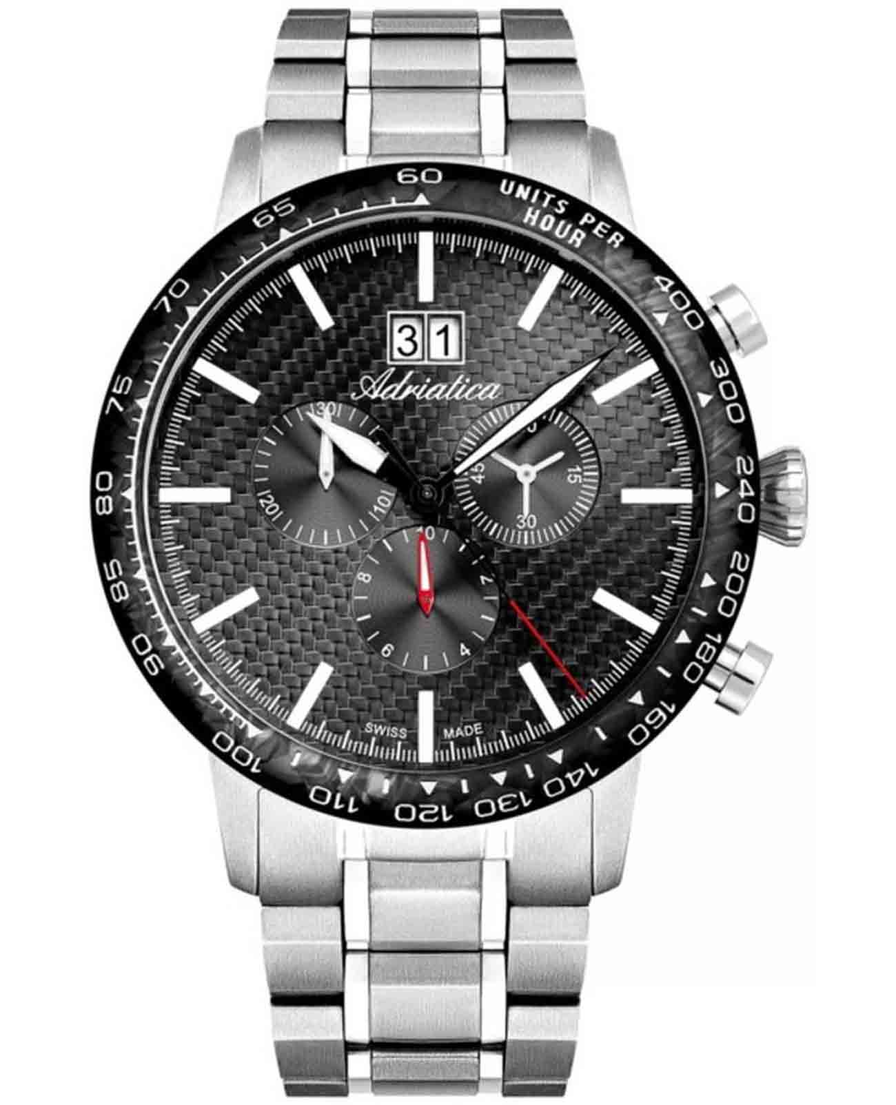 Мужские швейцарские часы-хронографХронографФункция позволяет измерять отрезки времени с особой точностью: часы, минуты, секунды. Верным признаком хронографа является наличие на циферблате 3 дополнительных окошек-счётчиков. с секундомеромСекундомерСекундоме́р — прибор, способный измерять интервалы времени с точностью до долей секунды. и тахиметромТахиметрРазмеченная шкала, располагается на ободке или безеле часов. Тахиметр позволяет рассчитать скорость на определённом участке пути, расстояние измеряется в километрах или милях. Adriatica Aviation A8383.4116CH воплощают в себе элегантность и функциональность, их выбирают целеустремленные мужчины, которые знают цену времени. Темно-серый циферблат часов, защищенный сапфировым стекломСапфировое стеклоПрочный и надёжный материал из кристалла сапфира синтетического происхождения, характеризующийся особой твёрдостью и устойчивостью к царапинам и повреждениям., заключен в корпус из титана диаметром 46 мм и толщиной 12 мм. Надежный кварцевый механизм с калибром Ronda 5040.B обеспечивает высокую точность, а водозащита 5 ATM делает часы устойчивыми к воздействию воды. Стальной браслет с раскладной застёжкойРаскладная застёжкаТакой тип застёжки используется только на браслетах из металла. Она никогда не раскрывается полностью, происходит разделение на 2 и более частей. Раскладывающая застёжка снизит вероятность потери часов к минимуму. обеспечивает комфортное и надежное ношение. Циферблат с метками в виде штрихов имеет 3 дополнительных циферблата, а также окошко даты в положении «12» , что добавляет практичности в повседневной жизни. Люминесцентное покрытиеЛюминесцентное покрытиеПозволяет считывать показания времени в темноте. Производители наносят на стрелки, часовые индексы, безель или поверхность циферблата светонакопительный состав, дающий холодное свечение. на стрелках и метках обеспечивает отличную видимость в темноте.