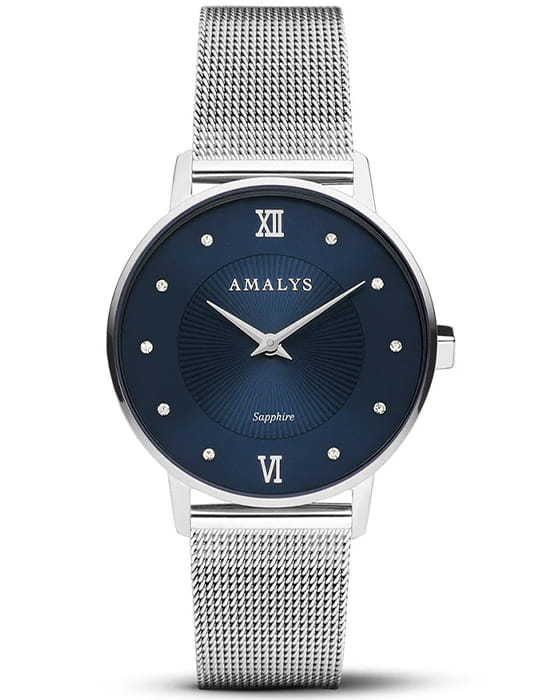 Amalys AMW-176 — женская модель с утончённым классическим дизайном, в которой сочетаются элегантность и практичность. Круглый корпус диаметром 33 мм выполнен из нержавеющей стали, гармонирующим с браслетом шириной 16 мм в том же исполнении. Защитную функцию выполняет сапфировое стеклоСапфировое стеклоПрочный и надёжный материал из кристалла сапфира синтетического происхождения, характеризующийся особой твёрдостью и устойчивостью к царапинам и повреждениям., стойкое к царапинам и сохраняющее прозрачность. Механизм — кварцевый, обеспечивающий точность и стабильность хода. Браслет миланского плетения снабжён раскладным замкомРаскладной замокДанный вариант застежки используется только на часах с металлическим браслетом. Отличительная особенность такого крепления в том, что длина браслета становится универсальной и вы можете самостоятельно отрегулировать нужный вам размер – застежка просто двигается по браслету часов., который сочетает надёжность фиксации и удобство повседневного использования. Водозащита 3 ATM защищает часы от случайных брызг и дождя. Циферблат с римскими индексами и изящными стрелками подчёркивает классическую эстетику модели, делая её уместной как в повседневных образах, так и в торжественной обстановке.