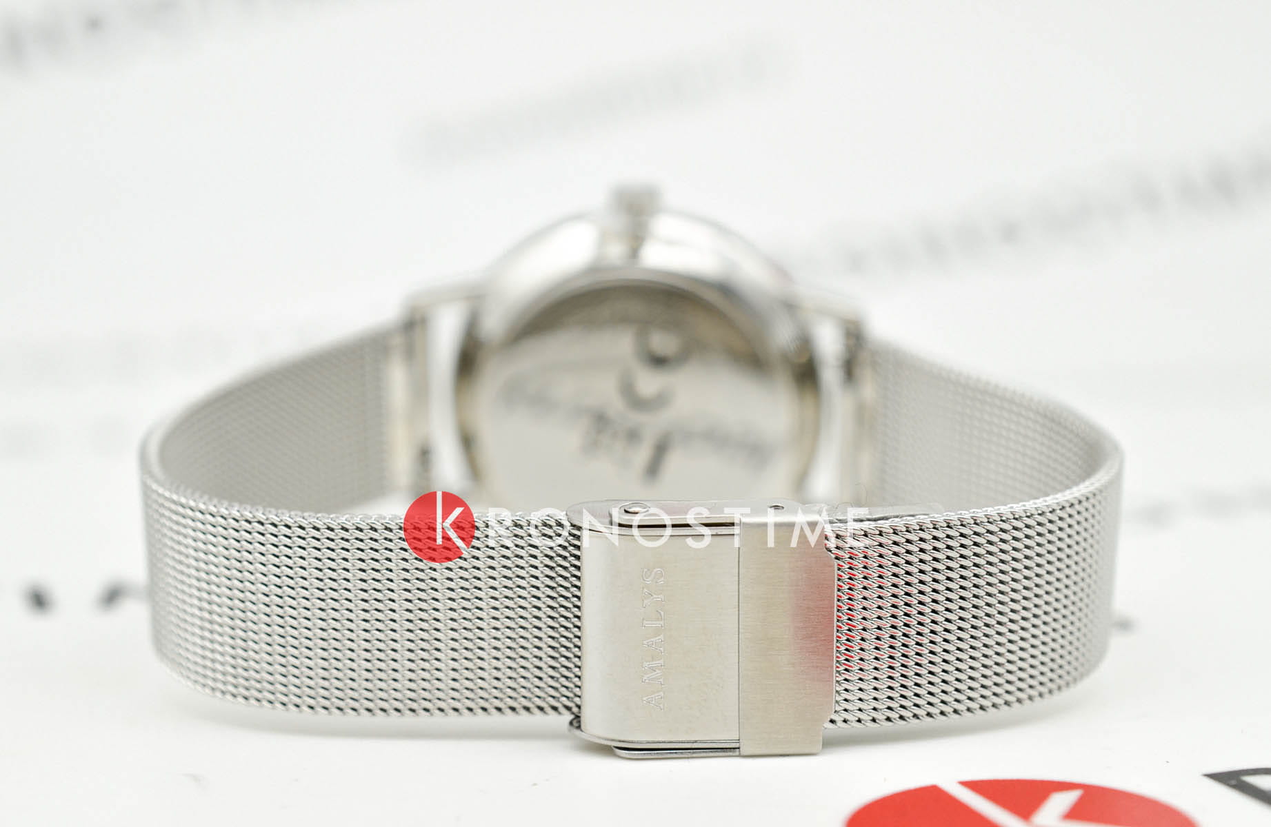 Amalys AMW-185 — женская модель с утончённым классическим дизайном, в которой сочетаются элегантность и практичность. Круглый корпус диаметром 33 мм выполнен из нержавеющей стали, гармонирующим с браслетом шириной 16 мм в том же исполнении. Защитную функцию выполняет сапфировое стеклоСапфировое стеклоПрочный и надёжный материал из кристалла сапфира синтетического происхождения, характеризующийся особой твёрдостью и устойчивостью к царапинам и повреждениям., стойкое к царапинам и сохраняющее прозрачность. Механизм — кварцевый, обеспечивающий точность и стабильность хода. Стальной браслет миланского плетения на раскладном замкеРаскладной замокДанный вариант застежки используется только на часах с металлическим браслетом. Отличительная особенность такого крепления в том, что длина браслета становится универсальной и вы можете самостоятельно отрегулировать нужный вам размер – застежка просто двигается по браслету часов. который сочетает надёжность фиксации и удобство повседневного использования. Водозащита 3 ATM защищает часы от случайных брызг и дождя. Циферблат с римскими индексами и изящными стрелками подчёркивает классическую эстетику модели, делая её уместной как в повседневных образах, так и в торжественной обстановке.