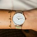 Amalys AMW-193 — женский набор, включающий часы и браслет, выполненный в едином элегантном стиле. Круглый корпус диаметром 33 мм изготовлен из нержавеющей стали с PVDPVDУльтратонкое покрытие наносится в технике вакуумного напыления, сочетает в себе нитрид титана особой прочности со слоем золота или оксида хрома. Несёт в себе декоративную или защитную функцию.-покрытием тёплого золотистого оттенка, что подчёркивает изысканный характер модели. Защитную функцию выполняет сапфировое стеклоСапфировое стеклоПрочный и надёжный материал из кристалла сапфира синтетического происхождения, характеризующийся особой твёрдостью и устойчивостью к царапинам и повреждениям., стойкое к царапинам и сохраняющее прозрачность. Механизм — кварцевый, обеспечивающий точность хода и удобство в использовании. Водозащита 3 ATM защищает от случайных брызг и дождя. Циферблат оформлен в минималистичном стиле с тонкими метками и изящными стрелками, подчёркивающими женственный образ. Стальной браслет миланского плетения с PVDPVDУльтратонкое покрытие наносится в технике вакуумного напыления, сочетает в себе нитрид титана особой прочности со слоем золота или оксида хрома. Несёт в себе декоративную или защитную функцию.-покрытием на раскладном замкеРаскладной замокДанный вариант застежки используется только на часах с металлическим браслетом. Отличительная особенность такого крепления в том, что длина браслета становится универсальной и вы можете самостоятельно отрегулировать нужный вам размер – застежка просто двигается по браслету часов. мягко облегает запястье и гармонично сочетается с корпусом. Дополняющий набор браслет усиливает впечатление цельности и придаёт образу завершённость.