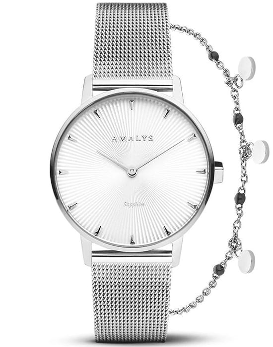 Amalys AMW-194 — женский набор, включающий часы и браслет, выполненный в едином элегантном стиле. Круглый корпус диаметром 33 мм изготовлен из нержавеющей стали, что подчёркивает изысканный характер модели. Защитную функцию выполняет сапфировое стеклоСапфировое стеклоПрочный и надёжный материал из кристалла сапфира синтетического происхождения, характеризующийся особой твёрдостью и устойчивостью к царапинам и повреждениям., стойкое к царапинам и сохраняющее прозрачность. Механизм — кварцевый, обеспечивающий точность хода и удобство в использовании. Водозащита 3 ATM защищает от случайных брызг и дождя. Циферблат оформлен в минималистичном стиле с тонкими метками и изящными стрелками, подчёркивающими женственный образ. Стальной браслет миланского плетения на раскладном замкеРаскладной замокДанный вариант застежки используется только на часах с металлическим браслетом. Отличительная особенность такого крепления в том, что длина браслета становится универсальной и вы можете самостоятельно отрегулировать нужный вам размер – застежка просто двигается по браслету часов. мягко облегает запястье и гармонично сочетается с корпусом. Дополняющий набор браслет усиливает впечатление цельности и придаёт образу завершённость.