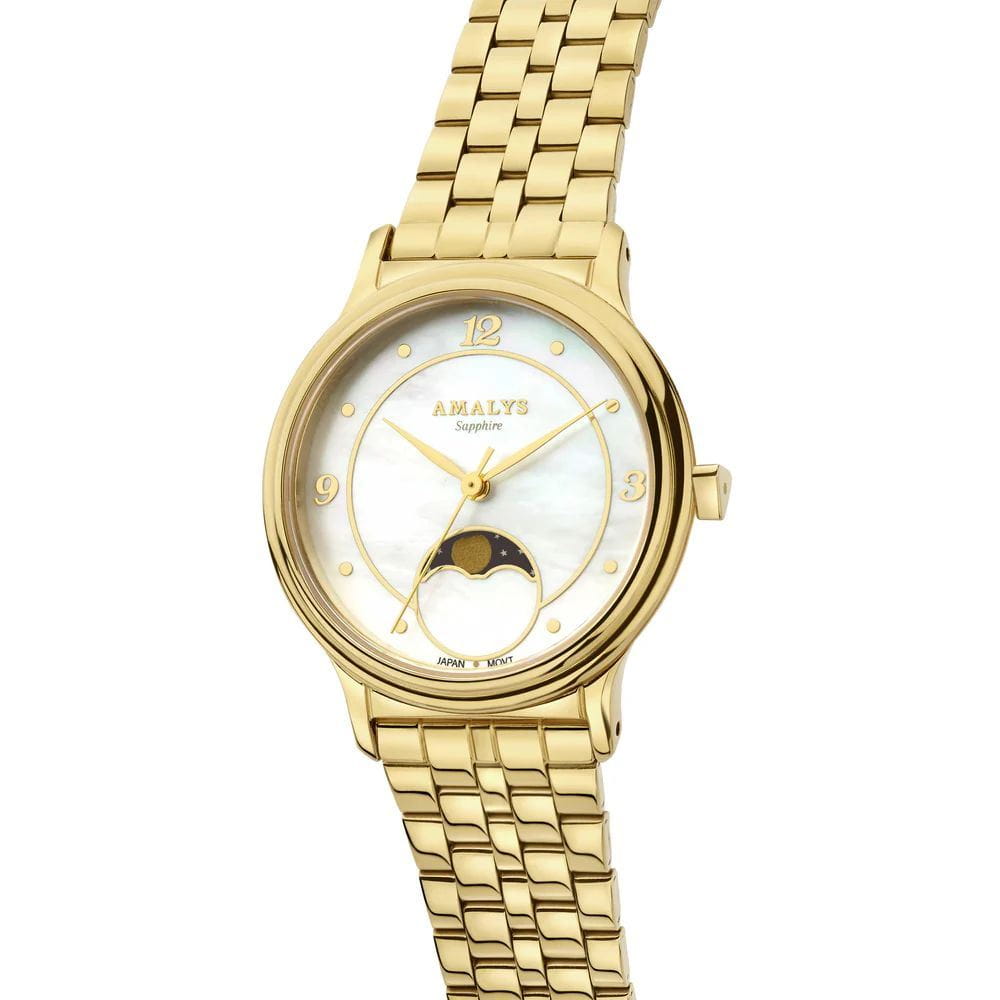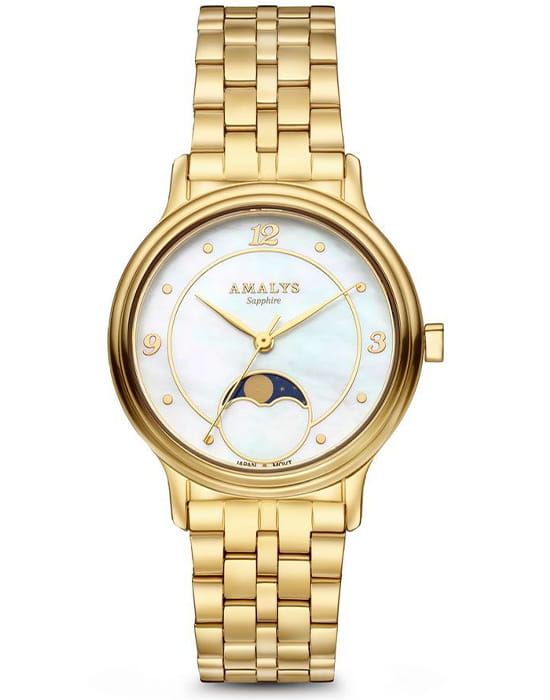 Amalys AMW-202 — женская модель с элегантным классическим стилем и утончёнными деталями. Круглый корпус изготовлен из нержавеющей стали с PVDPVDУльтратонкое покрытие наносится в технике вакуумного напыления, сочетает в себе нитрид титана особой прочности со слоем золота или оксида хрома. Несёт в себе декоративную или защитную функцию.-покрытием золотистого оттенка и гармонирует с браслетом в том же исполнении, состоящим из звеньев и обеспечивающим комфортное прилегание к запястью. Защитную функцию выполняет сапфировое стеклоСапфировое стеклоПрочный и надёжный материал из кристалла сапфира синтетического происхождения, характеризующийся особой твёрдостью и устойчивостью к царапинам и повреждениям., которое отличается стойкостью к царапинам и сохраняет высокую прозрачность. В основе лежит кварцевый механизм, гарантирующий точность хода и простоту эксплуатации. Циферблат украшен изящными арабскими цифрами и метками, дополнен утончённым индикатором фаз Луны, который придаёт часам особый шарм и делает их акцентной деталью образа. Водозащита 3 ATM защищает от случайных брызг и дождя. Модель сочетает функциональность и изысканность, подойдёт как для повседневного стиля, так и для особых случаев.