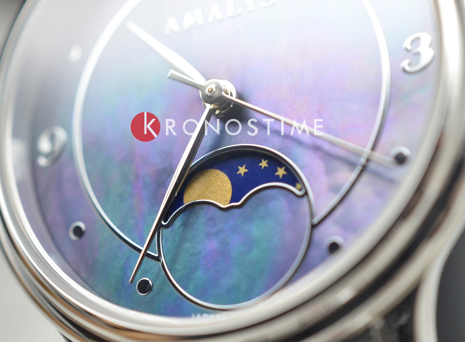 Amalys AMW-203 — женская модель с элегантным классическим стилем и утончёнными деталями. Круглый корпус изготовлен из нержавеющей стали и гармонирует с браслетом в том же исполнении, состоящим из звеньев и обеспечивающим комфортное прилегание к запястью. Защитную функцию выполняет сапфировое стеклоСапфировое стеклоПрочный и надёжный материал из кристалла сапфира синтетического происхождения, характеризующийся особой твёрдостью и устойчивостью к царапинам и повреждениям., которое отличается стойкостью к царапинам и сохраняет высокую прозрачность. В основе лежит кварцевый механизм, гарантирующий точность хода и простоту эксплуатации. Циферблат украшен изящными арабскими цифрами и метками, дополнен утончённым индикатором фаз Луны, который придаёт часам особый шарм и делает их акцентной деталью образа. Водозащита 3 ATM защищает от случайных брызг и дождя. Модель сочетает функциональность и изысканность, подойдёт как для повседневного стиля, так и для особых случаев.