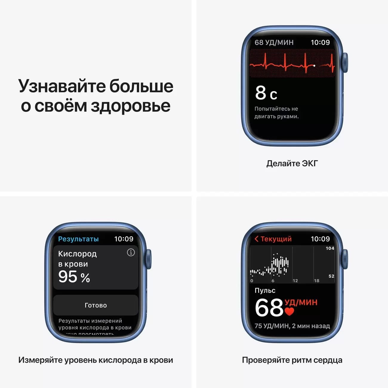 Умные часы Apple Watch Series 7 45mm Aluminum Case with Sport Band (MKN83), электронный механизм с высокой точностью. Класс водозащиты: 50 метров, позволит защитить корпус от случайных брызг или капель дождя. Корпус часов изготовлен из алюминия, цвета.