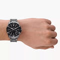 Мужские наручные часы-хронографХронографФункция позволяет измерять отрезки времени с особой точностью: часы, минуты, секунды. Верным признаком хронографа является наличие на циферблате 3 дополнительных окошек-счётчиков. с минеральным стекломМинеральное стеклоМинеральное стекло представляет собой искусственно выращенный минерал кварца. Такое стекло отличается особой устойчивостью к повреждениям и царапинам. Уступает по некоторым качествам сапфировому стеклу. Armani Exchange Dante AX1959, кварцевый механизм с высокой точностью. Класс водозащиты: 100 метров, позволит плавать, нырять и заниматься другими водными видами спорта. Корпус часов изготовлен из нержавеющей стали с IP-покрытиемIP-покрытиеМетод ионного напыления. Демонстрирует повышенную устойчивость к истиранию, окислению и химическим веществам. Под воздействием высокого давления и температуры около 1500°C молекулы металла надёжно соединяются с частицами корпуса часов.. Стальной браслет с IP-покрытиемIP-покрытиеМетод ионного напыления. Демонстрирует повышенную устойчивость к истиранию, окислению и химическим веществам. Под воздействием высокого давления и температуры около 1500°C молекулы металла надёжно соединяются с частицами корпуса часов. на раскладной застёжкеРаскладная застёжкаТакой тип застёжки используется только на браслетах из металла. Она никогда не раскрывается полностью, происходит разделение на 2 и более частей. Раскладывающая застёжка снизит вероятность потери часов к минимуму.. Вращающийся безельБезельВнешний ободок, закрепляющий стекло. В спортивных часах так называется поворотное кольцо с делениями на циферблате, выполняет роль таймера – замеряет отрезки времени на шкале. Неподвижный безель – элемент декора. Однонаправленно вращающийся безель на дайверских часах позволяет фиксировать моменты погружения и выныривания на поверхность. с IP-покрытиемIP-покрытиеМетод ионного напыления. Демонстрирует повышенную устойчивость к истиранию, окислению и химическим веществам. Под воздействием высокого давления и температуры около 1500°C молекулы металла надёжно соединяются с частицами корпуса часов.. Текстурированный циферблат с метками в виде штрихов.