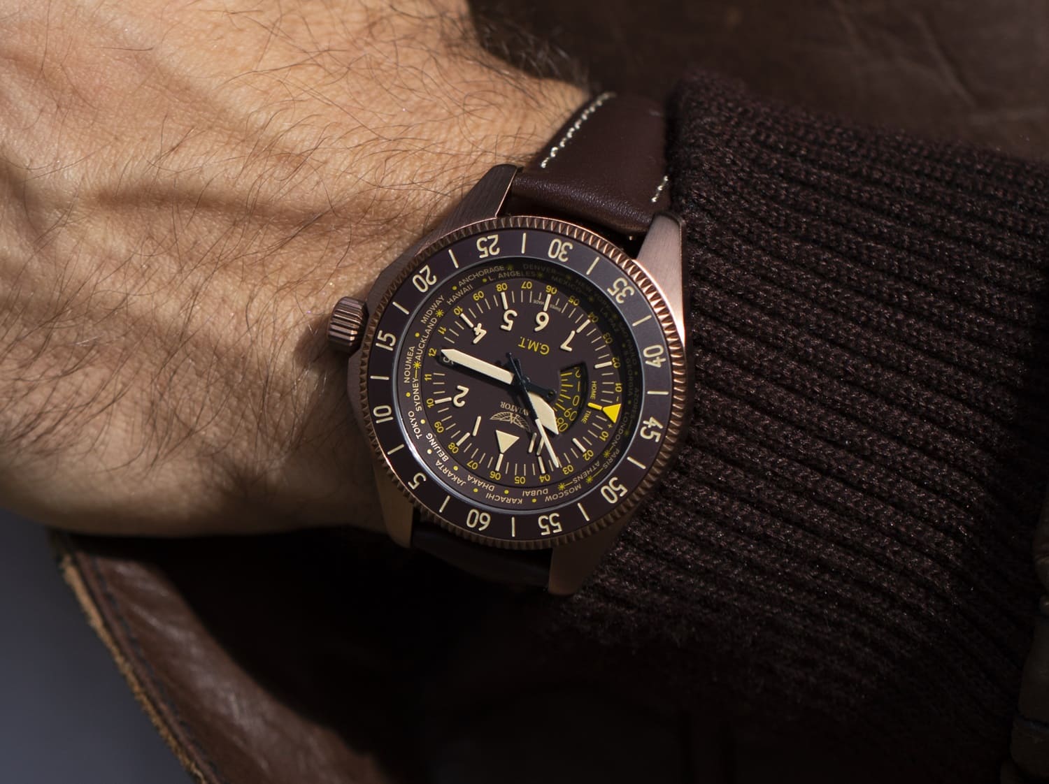 Aviator Airacobra GMT V.1.37.8.306.4 — сбалансированный швейцарский пилотский GMT, сочетающий техническую строгость с удобными функциями для путешествий. Корпус диаметром 42.8 мм и поворотный безельБезельВнешний ободок, закрепляющий стекло. В спортивных часах так называется поворотное кольцо с делениями на циферблате, выполняет роль таймера – замеряет отрезки времени на шкале. Неподвижный безель – элемент декора. Однонаправленно вращающийся безель на дайверских часах позволяет фиксировать моменты погружения и выныривания на поверхность. с керамической вставкой из нержавеющей стали 316 L с PVD-покрытиемPVDУльтратонкое покрытие наносится в технике вакуумного напыления, сочетает в себе нитрид титана особой прочности со слоем золота или оксида хрома. Несёт в себе декоративную или защитную функцию. обеспечивает уверенное ощущение надёжности, а герметичность до 100 м защищает при любой погоде. Циферблат отличается детальной функциональностью: в центре — крупные арабские цифры и стрелки, покрытые люминесцентным покрытиемЛюминесцентное покрытиеПозволяет считывать показания времени в темноте. Производители наносят на стрелки, часовые индексы, безель или поверхность циферблата светонакопительный состав, дающий холодное свечение. Superluminova, обеспечивающими мгновенное считывание времени даже в темноте. На «3 часах» — окошко даты, а индикатор второго часового пояса (GMT) удобно расположен на «9 часах». Безель с градусной шкалой для секунд — идеален для расчёта времени пути или времени прибытия. Циферблат защищён сапфировым стекломСапфировое стеклоПрочный и надёжный материал из кристалла сапфира синтетического происхождения, характеризующийся особой твёрдостью и устойчивостью к царапинам и повреждениям. с антибликовым покрытиемАнтибликовое покрытиеСлой оксида металла в 0,13-0,3 микрон, благодаря которому стекло часов не бликует и не отражает свет. Антибликовое покрытие уменьшает отражение света в 10 раз, обеспечивая отличную читаемость показателей циферблата., гарантирующим чёткий обзор без отражений. Кожаный ремень со стандартной застежкой сочетает в себе комфорт, элегантность и практичность. Airacobra GMT — инструментальное сочетание часовой точности, удобной функциональности GMT и авиационной эстетики, предназначенное для тех, кто ценит практичность и стиль в равной мере.