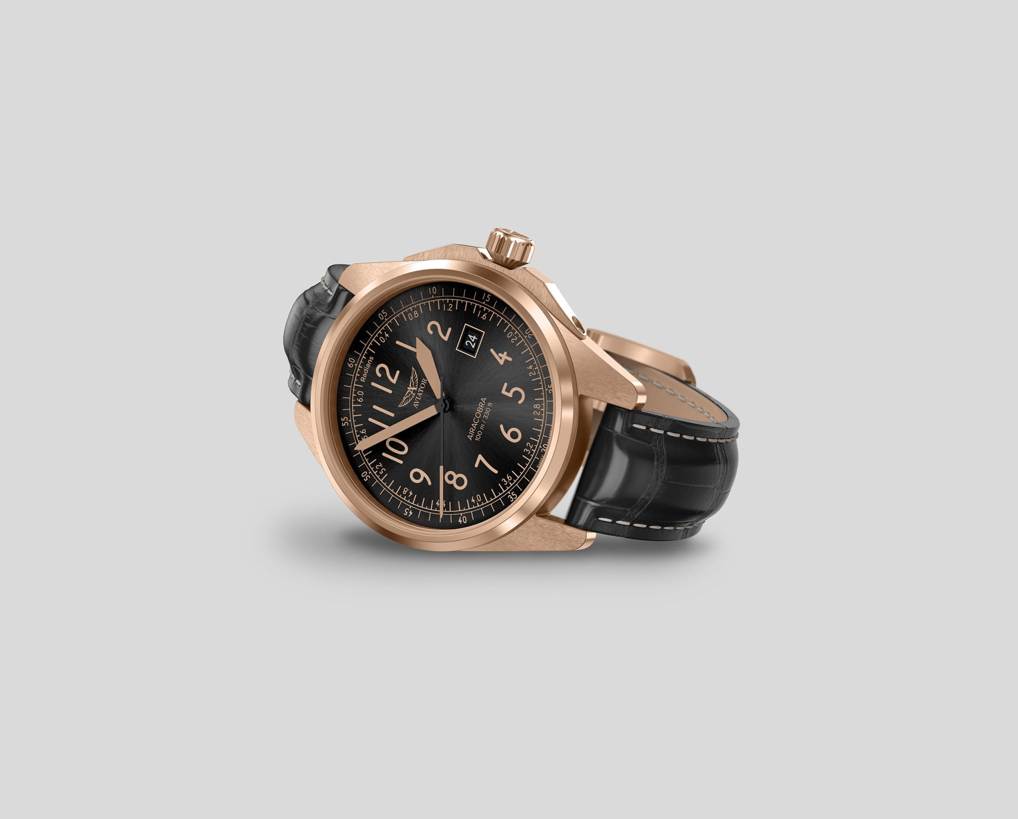 Aviator Airacobra 43 Type B V.1.38.2.323.4 — надёжные швейцарские пилотские часы с насыщенным функционалом и строгим авиационным дизайном. Корпус диаметром 42,8 мм выполнен из нержавеющей стали 316L с PVD-покрытиемPVDУльтратонкое покрытие наносится в технике вакуумного напыления, сочетает в себе нитрид титана особой прочности со слоем золота или оксида хрома. Несёт в себе декоративную или защитную функцию.. Циферблат имеет крупные арабские цифры и жёсткий контраст, соответствующий классическим пилотским образцам. Стрелки и метки покрыты люминесцентным покрытиемЛюминесцентное покрытиеПозволяет считывать показания времени в темноте. Производители наносят на стрелки, часовые индексы, безель или поверхность циферблата светонакопительный состав, дающий холодное свечение. Superluminova — это обеспечивает отличную читаемость в любых условиях. Окошко даты расположено у отметки «3 часа». На борту установлен швейцарский кварцевый механизм, способный с высокой точностью отображать время, дату. Циферблат защищён стойким сапфировым стекломСапфировое стеклоПрочный и надёжный материал из кристалла сапфира синтетического происхождения, характеризующийся особой твёрдостью и устойчивостью к царапинам и повреждениям. с антибликовым покрытиемАнтибликовое покрытиеСлой оксида металла в 0,13-0,3 микрон, благодаря которому стекло часов не бликует и не отражает свет. Антибликовое покрытие уменьшает отражение света в 10 раз, обеспечивая отличную читаемость показателей циферблата., завинчивающаяся заводная головка и задняя крышка обеспечивают уровень водозащиты до 100 метров. Кожаный ремень со стандартной застежкой обеспечивает удобство и надёжную фиксацию. Airacobra 43 Type B — инструментальные пилотские часы для тех, кто ценит надёжность, точность и удобную функциональность второго часового пояса в эстетике классических авиационных хронометров. Лимитированная серия.