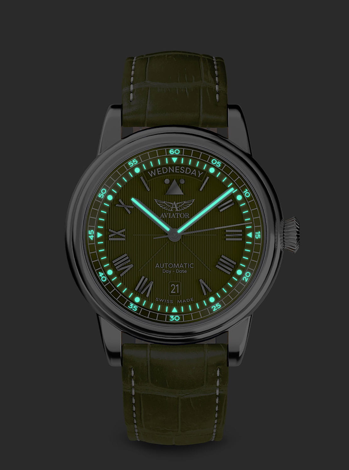 Aviator Douglas Day Date V.3.35.0.278.4 — швейцарские часы в классике авиадизайна, сочетающие безупречную читаемость и высокую надёжность. Лимитированная серия. Корпус диаметром 41,2 мм выполнен из нержавеющей стали 316L. Накладные метки выполнены в виде римских цифр. Окошко даты находится в положении 6 часов. День недели находится в положении 12 часов. Часовые метки и стрелки покрыты люминесцентным покрытиемЛюминесцентное покрытиеПозволяет считывать показания времени в темноте. Производители наносят на стрелки, часовые индексы, безель или поверхность циферблата светонакопительный состав, дающий холодное свечение. Superluminova, позволяющим легко определять время даже в тёмное время суток. Поверхность защищена прочным сапфировым стекломСапфировое стеклоПрочный и надёжный материал из кристалла сапфира синтетического происхождения, характеризующийся особой твёрдостью и устойчивостью к царапинам и повреждениям. с антибликовым покрытием, устойчивым к царапинам. Сердце модели — швейцарский механизм Sellita SW 240-1, известный своей точностью и долговечностью. Водозащита 100 метров, позволит плавать, нырять и заниматься другими водными видами спорта. Завинчивающаяся головка и задняя крышка обеспечивают уверенную ударопрочностьУдаропрочный корпусМеханизм заключён в корпус, выполненный из современных материалов, устойчивых к ударам, механическим повреждениям и падению с высоты: инновационный пластик, карбон, нержавеющая сталь, титан. и надёжную защиту от влаги и пыли. В механизме 26 камней, запас хода до 41 час. Модель дополнена кожаным ремешком с выразительной текстурой и классическим стилем, закреплённым с помощью застёжке-бабочке с кнопкамиЗастёжка "бабочка"Такой вид застёжки дополняется предохранителями, помогающими избежать случайного раскрытия браслета. Обладают изящным исполнением. — для максимального комфорта и лёгкости в повседневном использовании. Модель вдохновлена американским пассажирским самолетом Douglas DC-3, который является одним из лучших самолетов за всю историю авиации. Aviator — это образец лётной точности, инженерной чёткости и сдержанной роскоши, идеально подходящий для тех, кто ценит функциональность и уверенность в каждом элементе.