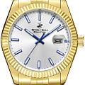 BEVERLY HILLS POLO CLUB BP3018X.130 — стильные мужские часы, сочетающие спортивную динамику и функциональность. Крупный корпус выполнен из нержавеющей стали с IP-покрытиемIP-покрытиеМетод ионного напыления. Демонстрирует повышенную устойчивость к истиранию, окислению и химическим веществам. Под воздействием высокого давления и температуры около 1500°C молекулы металла надёжно соединяются с частицами корпуса часов. золотистого цвета, диаметром 41 мм, гармонично дополнен стальным браслетом на застёжке-бабочке с кнопкамиЗастёжка "бабочка"Такой вид застёжки дополняется предохранителями, помогающими избежать случайного раскрытия браслета. Обладают изящным исполнением. . Рифленый неподвижный безельБезельВнешний ободок, закрепляющий стекло. В спортивных часах так называется поворотное кольцо с делениями на циферблате, выполняет роль таймера – замеряет отрезки времени на шкале. Неподвижный безель – элемент декора. Однонаправленно вращающийся безель на дайверских часах позволяет фиксировать моменты погружения и выныривания на поверхность.. Циферблат с акцентными метками и стрелками с люминесцентным покрытиемЛюминесцентное покрытиеПозволяет считывать показания времени в темноте. Производители наносят на стрелки, часовые индексы, безель или поверхность циферблата светонакопительный состав, дающий холодное свечение. делает модель более практичной. Минеральное стеклоМинеральное стеклоМинеральное стекло представляет собой искусственно выращенный минерал кварца. Такое стекло отличается особой устойчивостью к повреждениям и царапинам. Уступает по некоторым качествам сапфировому стеклу. с сапфировым покрытием защищает циферблат от царапин, а кварцевый механизм обеспечивает высокую точность. Окошко даты находится в положении 3 часа. Благодаря своей универсальной эстетике эти часы уместны и в деловой среде, и в повседневном образе. Идеальный выбор для тех, кто ценит элегантный дизайн и качество.