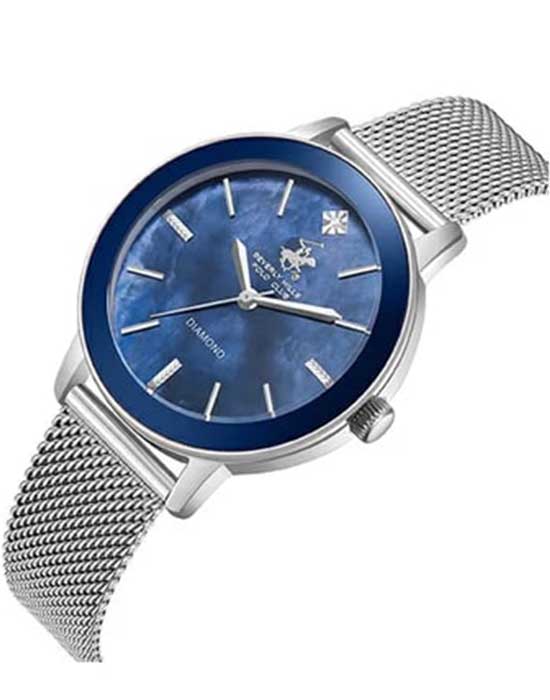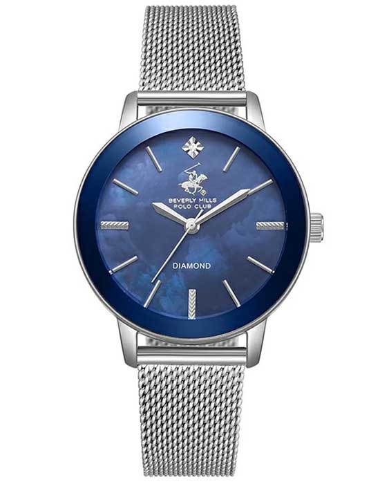 Beverly Hills Polo Club BP3734C.390 – элегантные женские часы, сочетающие стильный дизайн и высокую функциональность. Корпус диаметром 34 мм выполнен из нержавеющей стали, обеспечивающего прочность и долговечность. Перламутровый циферблат украшен синтетическим бриллиантом, придающими модели роскошный вид, и защищён минеральным стекломМинеральное стеклоМинеральное стекло представляет собой искусственно выращенный минерал кварца. Такое стекло отличается особой устойчивостью к повреждениям и царапинам. Уступает по некоторым качествам сапфировому стеклу., устойчивым к царапинам. БезельБезельВнешний ободок, закрепляющий стекло. В спортивных часах так называется поворотное кольцо с делениями на циферблате, выполняет роль таймера – замеряет отрезки времени на шкале. Неподвижный безель – элемент декора. Однонаправленно вращающийся безель на дайверских часах позволяет фиксировать моменты погружения и выныривания на поверхность. с PVD-покрытиемPVDУльтратонкое покрытие наносится в технике вакуумного напыления, сочетает в себе нитрид титана особой прочности со слоем золота или оксида хрома. Несёт в себе декоративную или защитную функцию.. Часы оснащены точным кварцевым механизмом, гарантирующим надёжное отображение времени. Стальной браслет миланского плетения на раскладном замкеРаскладной замокДанный вариант застежки используется только на часах с металлическим браслетом. Отличительная особенность такого крепления в том, что длина браслета становится универсальной и вы можете самостоятельно отрегулировать нужный вам размер – застежка просто двигается по браслету часов., обеспечивающий комфортное ношение и надёжную фиксацию на запястье. Водозащита до 50 метров (5 ATM) позволяет использовать часы в повседневной жизни, включая кратковременное погружение в воду.