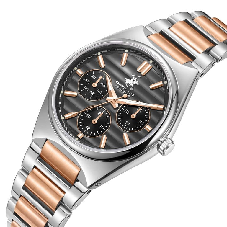 Beverly Hills Polo Club BP3746C.360 – элегантные женские часы, сочетающие стильный дизайн и высокую функциональность. Корпус диаметром 34 мм выполнен из суперметалла, обеспечивающего прочность и долговечность. Циферблат украшен, и защищён минеральным стекломМинеральное стеклоМинеральное стекло представляет собой искусственно выращенный минерал кварца. Такое стекло отличается особой устойчивостью к повреждениям и царапинам. Уступает по некоторым качествам сапфировому стеклу., устойчивым к царапинам. Часы оснащены точным кварцевым механизмом, гарантирующим надёжное отображение времени. Браслет из нержавеющей стали с PVD-покрытиемPVDУльтратонкое покрытие наносится в технике вакуумного напыления, сочетает в себе нитрид титана особой прочности со слоем золота или оксида хрома. Несёт в себе декоративную или защитную функцию. на застёжке-бабочке с кнопкамиЗастёжка "бабочка"Такой вид застёжки дополняется предохранителями, помогающими избежать случайного раскрытия браслета. Обладают изящным исполнением. , обеспечивающей комфортное ношение и надёжную фиксацию на запястье. Водозащита до 50 метров (5 ATM) позволяет использовать часы в повседневной жизни, включая кратковременное погружение в воду.