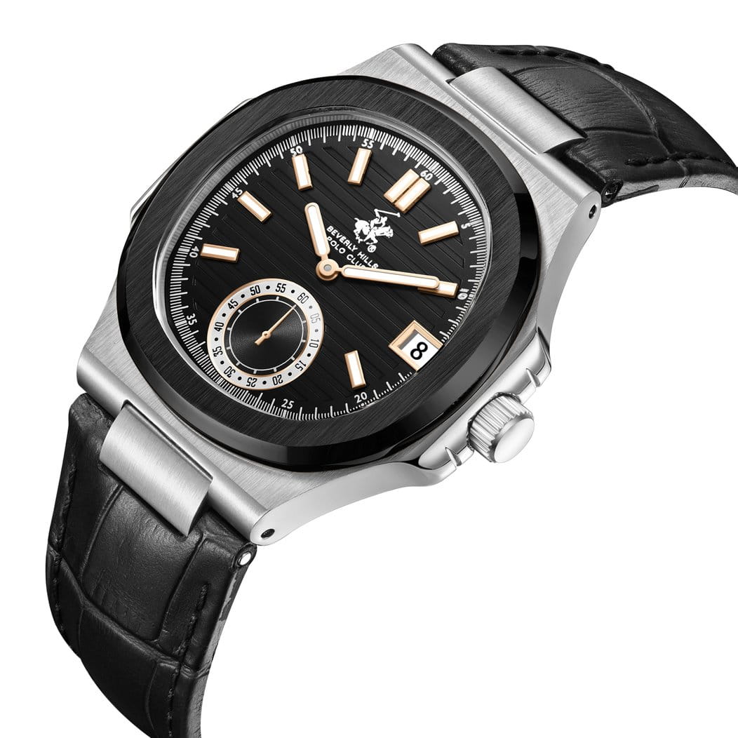 Американские мужские часы Beverly Hills Polo Club BP3792X.361 - это стильный мужской аксессуар, который сочетает элегантный дизайн и практичность. Корпус выполнен из нержавеющей стали серебристого цвета, диаметром 43,5 мм, что обеспечивает долговечность и утончённый внешний вид. Надежное минеральное стеклоМинеральное стеклоМинеральное стекло представляет собой искусственно выращенный минерал кварца. Такое стекло отличается особой устойчивостью к повреждениям и царапинам. Уступает по некоторым качествам сапфировому стеклу. с сапфировым покрытием защищает циферблат от царапин и обеспечивает долговечность. Модель оснащена кварцевым механизмом, обеспечивающим высокую точность хода. Неподвижный безельБезельВнешний ободок, закрепляющий стекло. В спортивных часах так называется поворотное кольцо с делениями на циферблате, выполняет роль таймера – замеряет отрезки времени на шкале. Неподвижный безель – элемент декора. Однонаправленно вращающийся безель на дайверских часах позволяет фиксировать моменты погружения и выныривания на поверхность. с IP-покрытиемIP-покрытиеМетод ионного напыления. Демонстрирует повышенную устойчивость к истиранию, окислению и химическим веществам. Под воздействием высокого давления и температуры около 1500°C молекулы металла надёжно соединяются с частицами корпуса часов. черного цвета. Кожаный ремешок на стандартной застежке обеспечивает комфортное ношение. Окошко даты находится в положении 3 часа. Стрелки и метки с люминесцентным покрытиемЛюминесцентное покрытиеПозволяет считывать показания времени в темноте. Производители наносят на стрелки, часовые индексы, безель или поверхность циферблата светонакопительный состав, дающий холодное свечение. позволяют легко считывать время даже в условиях недостаточного освещения. Водозащита 50 метров позволит защитить корпус от случайных брызг или капель дождя. Эта модель – отличный выбор для тех, кто ищет сочетание стиля, качества и функциональности. Часы станут не только полезным аксессуаром, но и выразительным элементом вашего имиджа.