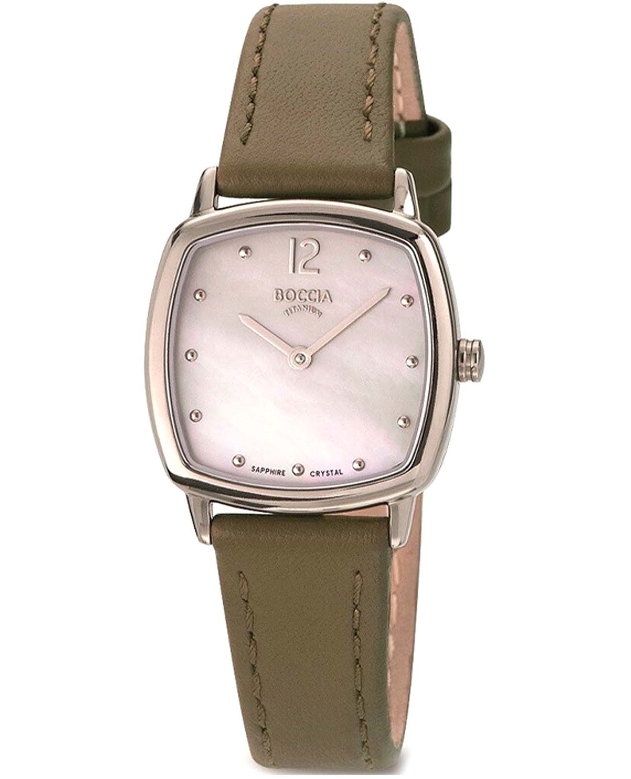Женские наручные часы Boccia Titanium 3343-01 с надёжным кварцевым механизмом. Корпус часов изготовлен из прочного титана диаметром 25x25 мм, что обеспечивает не только долговечность, но и элегантность внешнего вида. Сапфировое стеклоСапфировое стеклоПрочный и надёжный материал из кристалла сапфира синтетического происхождения, характеризующийся особой твёрдостью и устойчивостью к царапинам и повреждениям. используемое в конструкции этих часов, отличается повышенной устойчивостью к царапинам и превосходной прозрачностью, гарантируя, что циферблат всегда останется чистым и легко читаемым. Класс водозащиты: 50 метров, позволит защитить корпус от случайных брызг или капель дождя. Метки в виде точек и арабской цифры 12 на перламутровом циферблате. Кожаный ремешок с классической застежкой обеспечивает комфортное ношение.