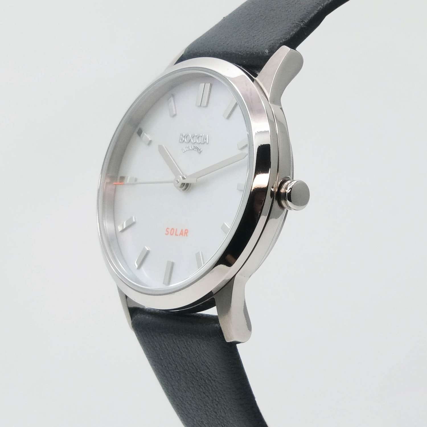 Часы Boccia 3363-01 — это утонченный аксессуар для женщин, сочетающий в себе элегантность и надежность. Эти кварцевые часы оснащены солнечной батареей. Белый перламутровый циферблат придает модели классическую изысканность, гармонично сочетаясь с круглым корпусом из гипоаллергенного титана. Диаметр корпуса составляет 30 мм, что делает часы аккуратными и элегантными, идеально подходящими для женской руки. Черный кожаный ремешок с классической застежкой добавляет комфорта и завершает стильный образ. Часы защищены прочным минеральным стекломМинеральное стеклоМинеральное стекло представляет собой искусственно выращенный минерал кварца. Такое стекло отличается особой устойчивостью к повреждениям и царапинам. Уступает по некоторым качествам сапфировому стеклу., устойчивым к мелким механическим повреждениям, что обеспечивает их долговечность и сохранение презентабельного вида. Водостойкость на уровне WR 50 позволяет не беспокоиться о попадании воды при мытье рук или в дождливую погоду.