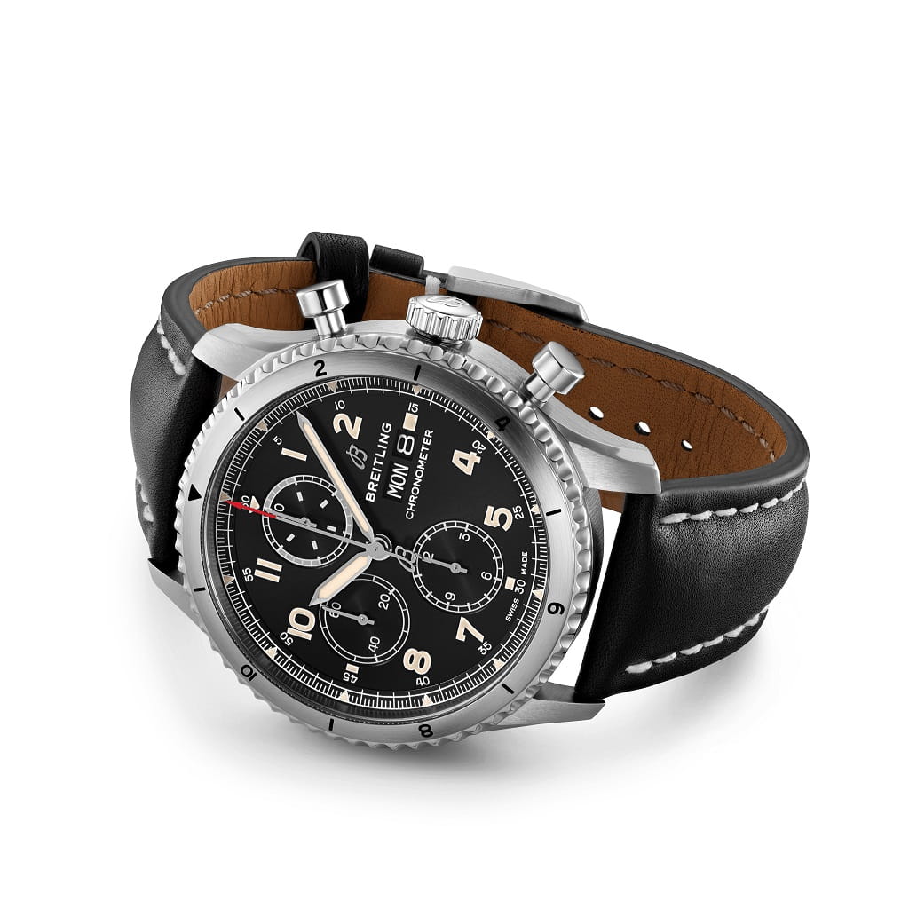 Модель Aviator 8 Chronograph 43 A13316101B1X1 оснащена 30-минутным и 12-часовым счетчиками, расположенными в положении «12» и «6 часов», а также малой секундной стрелкой в положении «9 часов». Уровень точности достигает 1/4 секунды. «Сердце» данной модели – калибр Breitling Caliber 13, подтвержденный сертификатом Швейцарского института официального тестирования хронометров (COSC). Он приводится в действие однонаправленным ротором с шарикоподшипниками и обладает запасом хода более 42 часов. Сплошная крышка корпуса диаметром 43 мм крепится на винтах.