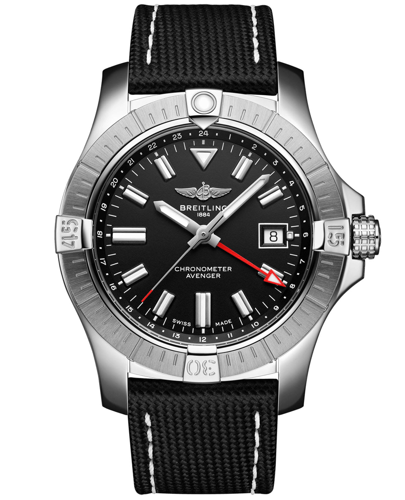 Мужские швейцарские часы Breitling Avenger Automatic GMT 43 A32397101B1X2, механический механизм (автоматический калибр) Breitling 32 с высокой точностью. Выпуклое сапфировое стекло устойчивое к появлению царапин, обладающее высокой прозрачностью и антибликовым покрытием с обеих сторон.