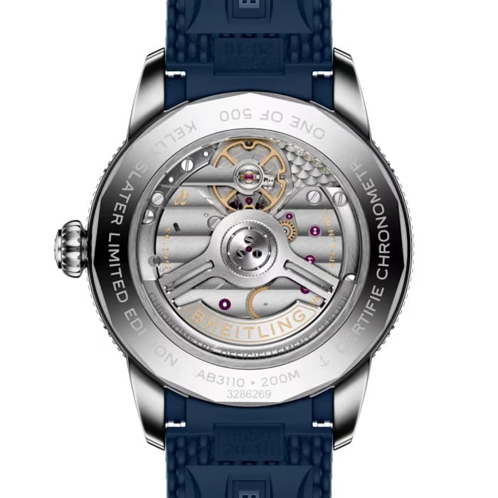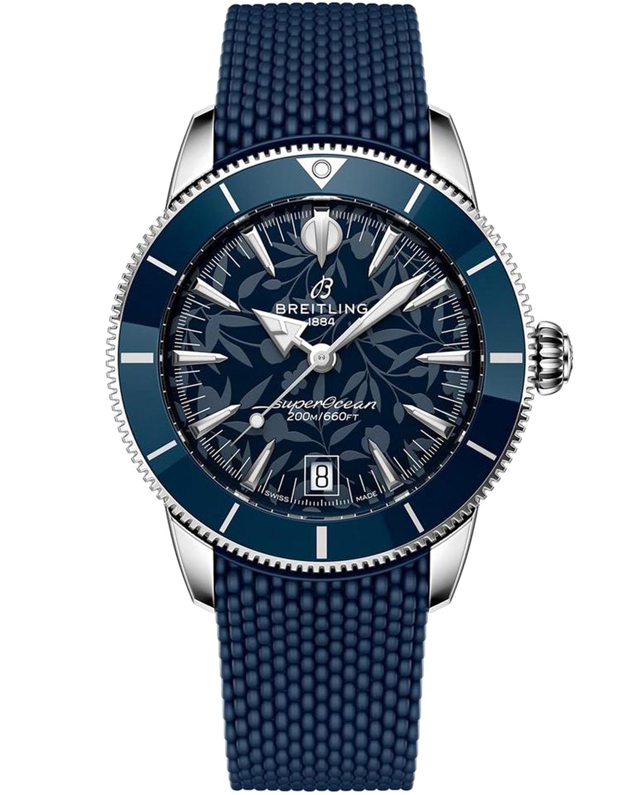 Мужские механические часы Breitling Superocean Heritage B31 Automatic 40 «Kelly Slater Limited Edition» AB31101A1C1S1 — это стильное сочетание элегантности и современного дизайна. Корпус из нержавеющей стали диаметром 40 мм, идеально сбалансирован и элегантен. На циферблате изображен узор из тропической листвы, передающий атмосферу гавайского рая. Сапфировое стеклоСапфировое стеклоПрочный и надёжный материал из кристалла сапфира синтетического происхождения, характеризующийся особой твёрдостью и устойчивостью к царапинам и повреждениям. с антибликовым покрытием защищает циферблат от царапин и обеспечивает отличную читаемость при любом освещении. Каучуковый ремешок на раскладной застёжкеРаскладная застёжкаТакой тип застёжки используется только на браслетах из металла. Она никогда не раскрывается полностью, происходит разделение на 2 и более частей. Раскладывающая застёжка снизит вероятность потери часов к минимуму. идеально дополняют дизайн часов, обеспечивая комфортное ношение. Стрелки и метки на циферблате имеют люминесцентное покрытиеЛюминесцентное покрытиеПозволяет считывать показания времени в темноте. Производители наносят на стрелки, часовые индексы, безель или поверхность циферблата светонакопительный состав, дающий холодное свечение. Super-LumiNova® позволяющее легко определять время даже в темноте. Вращающийся безельБезельВнешний ободок, закрепляющий стекло. В спортивных часах так называется поворотное кольцо с делениями на циферблате, выполняет роль таймера – замеряет отрезки времени на шкале. Неподвижный безель – элемент декора. Однонаправленно вращающийся безель на дайверских часах позволяет фиксировать моменты погружения и выныривания на поверхность. с керамической вставкой обеспечивает исключительную устойчивость к царапинам. Часы обладают впечатляющей водонепроницаемостью до 20 бар (200 метров), что делает их идеальными для плавания, ныряния и погружений с аквалангом. Окошко даты находится в положении 6 часов. Прочная конструкция часов и высокопроизводительный механизм делают их идеальным спутником для любителей активного отдыха. В коллекции представлен автоматический механизм B31, первый эксклюзивный калибр Breitling с тремя стрелками.