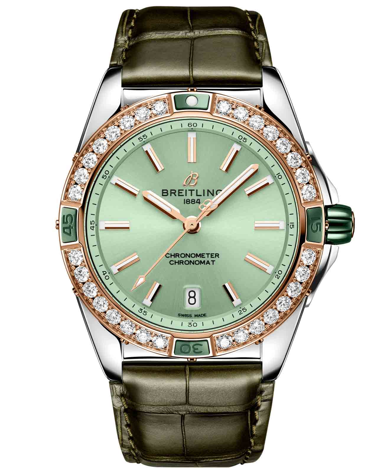 Женские швейцарские часы Breitling Super Chronomat Automatic 38 U17356531L1P1, механический механизм (автоматический калибр) с высокой точностью. Сапфировое стеклоСапфировое стеклоПрочный и надёжный материал из кристалла сапфира синтетического происхождения, характеризующийся особой твёрдостью и устойчивостью к царапинам и повреждениям. устойчивое к появлению царапин, обладающее высокой прозрачностью. Класс водозащиты: 100 метров, позволит плавать, нырять и заниматься другими водными видами спорта. Корпус часов изготовлен из стали. Кожаный крокодиловый ремешок с раскладной застёжкойРаскладная застёжкаТакой тип застёжки используется только на браслетах из металла. Она никогда не раскрывается полностью, происходит разделение на 2 и более частей. Раскладывающая застёжка снизит вероятность потери часов к минимуму.. Отличить Super от остальных моделей семейства Chronomat можно по керамическим язычкам и заводной головке. Помимо улучшенного внешнего вида, Automatic 38 также имеет сияющую сторону. БезельБезельВнешний ободок, закрепляющий стекло. В спортивных часах так называется поворотное кольцо с делениями на циферблате, выполняет роль таймера – замеряет отрезки времени на шкале. Неподвижный безель – элемент декора. Однонаправленно вращающийся безель на дайверских часах позволяет фиксировать моменты погружения и выныривания на поверхность. из красного золота 18 карат украшен крупными бриллиантами, выращенными в лабораторных условиях. Цвета циферблата добавляют как раз нужное количество привлекательности для глаз. Окошко даты находится в положении 6 часов. Стрелки и метки с люминесцентным покрытиемЛюминесцентное покрытиеПозволяет считывать показания времени в темноте. Производители наносят на стрелки, часовые индексы, безель или поверхность циферблата светонакопительный состав, дающий холодное свечение..