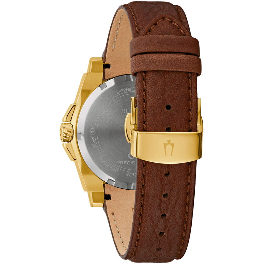 Мужские кварцевые наручные часы Bulova Precisionist 97B216 – отражающий идеальное сочетание современного дизайна, надёжности и функциональности. Корпус из нержавеющей стали с IP-покрытиемIP-покрытиеМетод ионного напыления. Демонстрирует повышенную устойчивость к истиранию, окислению и химическим веществам. Под воздействием высокого давления и температуры около 1500°C молекулы металла надёжно соединяются с частицами корпуса часов. золотистого цвета, диаметром 40 мм идеально сбалансирован и надежен. Сапфировое стеклоСапфировое стеклоПрочный и надёжный материал из кристалла сапфира синтетического происхождения, характеризующийся особой твёрдостью и устойчивостью к царапинам и повреждениям. защищает циферблат от царапин и устойчивое к механическим повреждениям. Кожаный ремешок на застёжке-бабочке с кнопкамиЗастёжка "бабочка"Такой вид застёжки дополняется предохранителями, помогающими избежать случайного раскрытия браслета. Обладают изящным исполнением. обеспечивает комфортное ношение. Окошко даты находится в положении 3 часа. Циферблат с часовыми индексами в виде штрихов и цифр. 12/24х часовой формат времени. Водозащита 100 метров позволит плавать, нырять и заниматься другими водными видами спорта. Стрелки и метки с люминесцентным покрытиемЛюминесцентное покрытиеПозволяет считывать показания времени в темноте. Производители наносят на стрелки, часовые индексы, безель или поверхность циферблата светонакопительный состав, дающий холодное свечение. позволяющие легко определять время даже в темноте. Эта модель – отличный выбор для тех, кто ищет сочетание стиля, качества и функциональности. Часы станут не только полезным аксессуаром, но и выразительным элементом вашего имиджа.