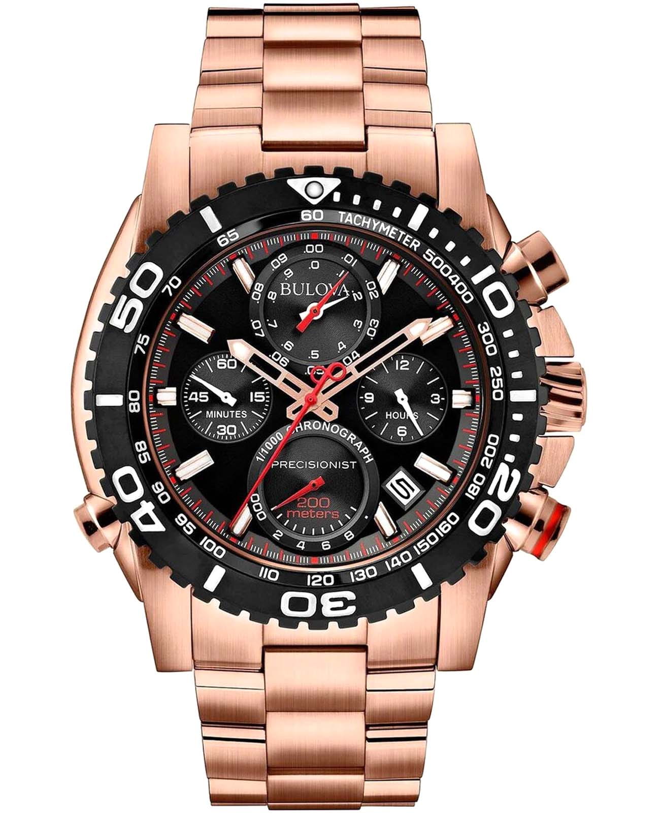 Мужские кварцевые часы-хронографХронографФункция позволяет измерять отрезки времени с особой точностью: часы, минуты, секунды. Верным признаком хронографа является наличие на циферблате 3 дополнительных окошек-счётчиков. с секундомеромСекундомерСекундоме́р — прибор, способный измерять интервалы времени с точностью до долей секунды. Bulova Precisionist 98B213 – отражающий идеальное сочетание современного дизайна, надёжности и функциональности. Корпус из нержавеющей стали с PVD-покрытиемPVDУльтратонкое покрытие наносится в технике вакуумного напыления, сочетает в себе нитрид титана особой прочности со слоем золота или оксида хрома. Несёт в себе декоративную или защитную функцию. цвета розового золота, диаметром 47 мм идеально сбалансирован и надежен. Минеральное стеклоМинеральное стеклоМинеральное стекло представляет собой искусственно выращенный минерал кварца. Такое стекло отличается особой устойчивостью к повреждениям и царапинам. Уступает по некоторым качествам сапфировому стеклу. защищает циферблат от царапин и устойчивое к механическим повреждениям. Окошко даты находится в положении между 4 и 5 часов. Стальной браслет на раскладной застёжке с фиксаторомРаскладная застёжкаТакой тип застёжки используется только на браслетах из металла. Она никогда не раскрывается полностью, происходит разделение на 2 и более частей. Раскладывающая застёжка снизит вероятность потери часов к минимуму. обеспечивает комфортное ношение. На безельБезельВнешний ободок, закрепляющий стекло. В спортивных часах так называется поворотное кольцо с делениями на циферблате, выполняет роль таймера – замеряет отрезки времени на шкале. Неподвижный безель – элемент декора. Однонаправленно вращающийся безель на дайверских часах позволяет фиксировать моменты погружения и выныривания на поверхность. с PVD-покрытиемPVDУльтратонкое покрытие наносится в технике вакуумного напыления, сочетает в себе нитрид титана особой прочности со слоем золота или оксида хрома. Несёт в себе декоративную или защитную функцию. нанесена шкала тахиметраТахиметрРазмеченная шкала, располагается на ободке или безеле часов. Тахиметр позволяет рассчитать скорость на определённом участке пути, расстояние измеряется в километрах или милях.. Водозащита 200 метров позволит плавать, нырять и заниматься другими водными видами спорта. Стрелки и метки с люминесцентным покрытиемЛюминесцентное покрытиеПозволяет считывать показания времени в темноте. Производители наносят на стрелки, часовые индексы, безель или поверхность циферблата светонакопительный состав, дающий холодное свечение. позволяющие легко определять время даже в темноте. Эта модель – отличный выбор для тех, кто ищет сочетание стиля, качества и функциональности. Часы станут не только полезным аксессуаром, но и выразительным элементом вашего имиджа.