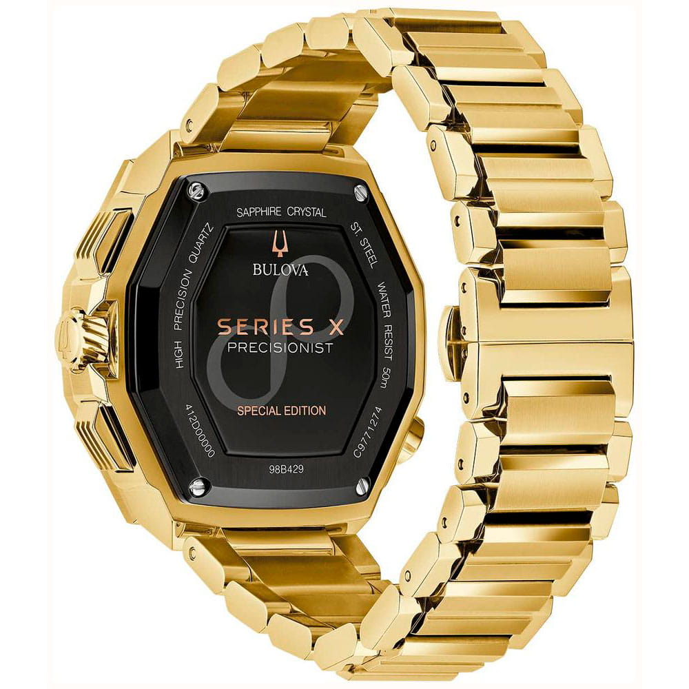 Мужские кварцевые часы-хронографХронографФункция позволяет измерять отрезки времени с особой точностью: часы, минуты, секунды. Верным признаком хронографа является наличие на циферблате 3 дополнительных окошек-счётчиков. с секундомеромСекундомерСекундоме́р — прибор, способный измерять интервалы времени с точностью до долей секунды. Bulova Precisionist X Special Edition 98B429 – отражающий идеальное сочетание современного дизайна, надёжности и функциональности. Сверхточный кварцевый хронограф. Частота колебаний механизма составляет 262 кГц , что превышает мировой стандарт в 8 раз. Корпус из нержавеющей стали с PVD-покрытиемPVDУльтратонкое покрытие наносится в технике вакуумного напыления, сочетает в себе нитрид титана особой прочности со слоем золота или оксида хрома. Несёт в себе декоративную или защитную функцию. золотистого цвета, диаметром 44.5 мм идеально сбалансирован и надежен. Сапфировое стеклоСапфировое стеклоПрочный и надёжный материал из кристалла сапфира синтетического происхождения, характеризующийся особой твёрдостью и устойчивостью к царапинам и повреждениям. защищает циферблат от царапин и устойчивое к механическим повреждениям. На черном циферблате есть окошко календаря. Стальной браслет на застёжке-бабочке с кнопкамиЗастёжка "бабочка"Такой вид застёжки дополняется предохранителями, помогающими избежать случайного раскрытия браслета. Обладают изящным исполнением. обеспечивает комфортное ношение. БезельБезельВнешний ободок, закрепляющий стекло. В спортивных часах так называется поворотное кольцо с делениями на циферблате, выполняет роль таймера – замеряет отрезки времени на шкале. Неподвижный безель – элемент декора. Однонаправленно вращающийся безель на дайверских часах позволяет фиксировать моменты погружения и выныривания на поверхность. с вставкой из серой дамасской стали. Водозащита 50 метров позволит защитить корпус от случайных брызг или капель дождя. Стрелки и метки с люминесцентным покрытиемЛюминесцентное покрытиеПозволяет считывать показания времени в темноте. Производители наносят на стрелки, часовые индексы, безель или поверхность циферблата светонакопительный состав, дающий холодное свечение. позволяющие легко определять время даже в темноте. Эта модель – отличный выбор для тех, кто ищет сочетание стиля, качества и функциональности. Часы станут не только полезным аксессуаром, но и выразительным элементом вашего имиджа.