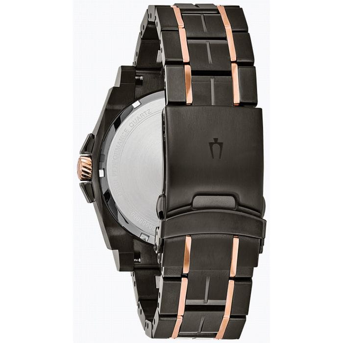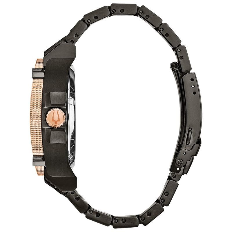 Мужские кварцевые наручные часы Bulova Precisionist 98D149 – отражающий идеальное сочетание современного дизайна, надёжности и функциональности. Корпус из нержавеющей стали с IP-покрытиемIP-покрытиеМетод ионного напыления. Демонстрирует повышенную устойчивость к истиранию, окислению и химическим веществам. Под воздействием высокого давления и температуры около 1500°C молекулы металла надёжно соединяются с частицами корпуса часов. черного цвета, диаметром 46.5 мм идеально сбалансирован и надежен. Минеральное стеклоМинеральное стеклоМинеральное стекло представляет собой искусственно выращенный минерал кварца. Такое стекло отличается особой устойчивостью к повреждениям и царапинам. Уступает по некоторым качествам сапфировому стеклу. защищает циферблат от царапин и устойчивое к механическим повреждениям. Апертура даты в позиции 3 часов. 12/24х часовой формат времени. Стальной браслет на раскладной застёжке с фиксаторомРаскладная застёжкаТакой тип застёжки используется только на браслетах из металла. Она никогда не раскрывается полностью, происходит разделение на 2 и более частей. Раскладывающая застёжка снизит вероятность потери часов к минимуму. обеспечивает комфортное ношение. БезельБезельВнешний ободок, закрепляющий стекло. В спортивных часах так называется поворотное кольцо с делениями на циферблате, выполняет роль таймера – замеряет отрезки времени на шкале. Неподвижный безель – элемент декора. Однонаправленно вращающийся безель на дайверских часах позволяет фиксировать моменты погружения и выныривания на поверхность. с IP-покрытиемIP-покрытиеМетод ионного напыления. Демонстрирует повышенную устойчивость к истиранию, окислению и химическим веществам. Под воздействием высокого давления и температуры около 1500°C молекулы металла надёжно соединяются с частицами корпуса часов. цвета розового золота. Водозащита 300 метров позволит плавать, нырять и заниматься другими водными видами спорта. Стрелки с люминесцентным покрытиемЛюминесцентное покрытиеПозволяет считывать показания времени в темноте. Производители наносят на стрелки, часовые индексы, безель или поверхность циферблата светонакопительный состав, дающий холодное свечение. позволяющие легко определять время даже в темноте. Заводная головка с защитой. Эта модель – отличный выбор для тех, кто ищет сочетание стиля, качества и функциональности. Часы станут не только полезным аксессуаром, но и выразительным элементом вашего имиджа.