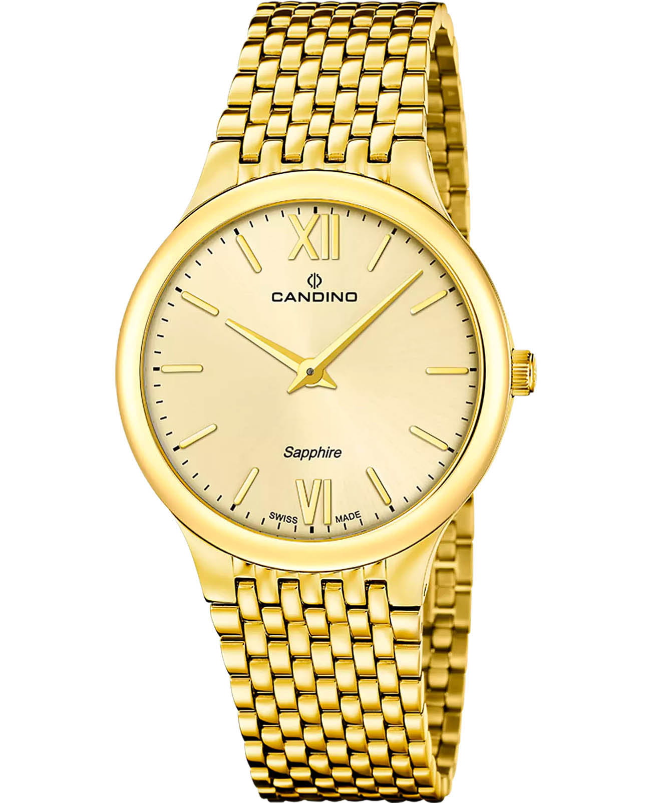 Мужские кварцевые часы Candino из коллекции Series 1947 — это сочетание минимализма, швейцарского качества и современного дизайна. Корпус диаметром 39 мм и толщиной 6 мм выполнен из нержавеющей стали 316L с PVD-покрытиемPVDУльтратонкое покрытие наносится в технике вакуумного напыления, сочетает в себе нитрид титана особой прочности со слоем золота или оксида хрома. Несёт в себе декоративную или защитную функцию. жёлтого золота. Циферблат золотого цвета оформлен двумя стрелками без индикации даты, что придаёт дизайну чистоту и элегантность. Циферблат защищён сапфировым стекломСапфировое стеклоПрочный и надёжный материал из кристалла сапфира синтетического происхождения, характеризующийся особой твёрдостью и устойчивостью к царапинам и повреждениям., устойчивым к царапинам. Механизм — кварцевый произведённый в Швейцарии. Часы оснащены стальным браслетом с PVD-покрытиемPVDУльтратонкое покрытие наносится в технике вакуумного напыления, сочетает в себе нитрид титана особой прочности со слоем золота или оксида хрома. Несёт в себе декоративную или защитную функцию. жёлтого золота на застёжке «бабочка» с кнопкамиЗастёжка "бабочка"Такой вид застёжки дополняется предохранителями, помогающими избежать случайного раскрытия браслета. Обладают изящным исполнением. . Водонепроницаемость 50 м позволяет использовать часы в повседневных условиях. Гарантия — 2 года. Идеальный выбор для тех, кто ценит лаконичный стиль, точность и надёжность.