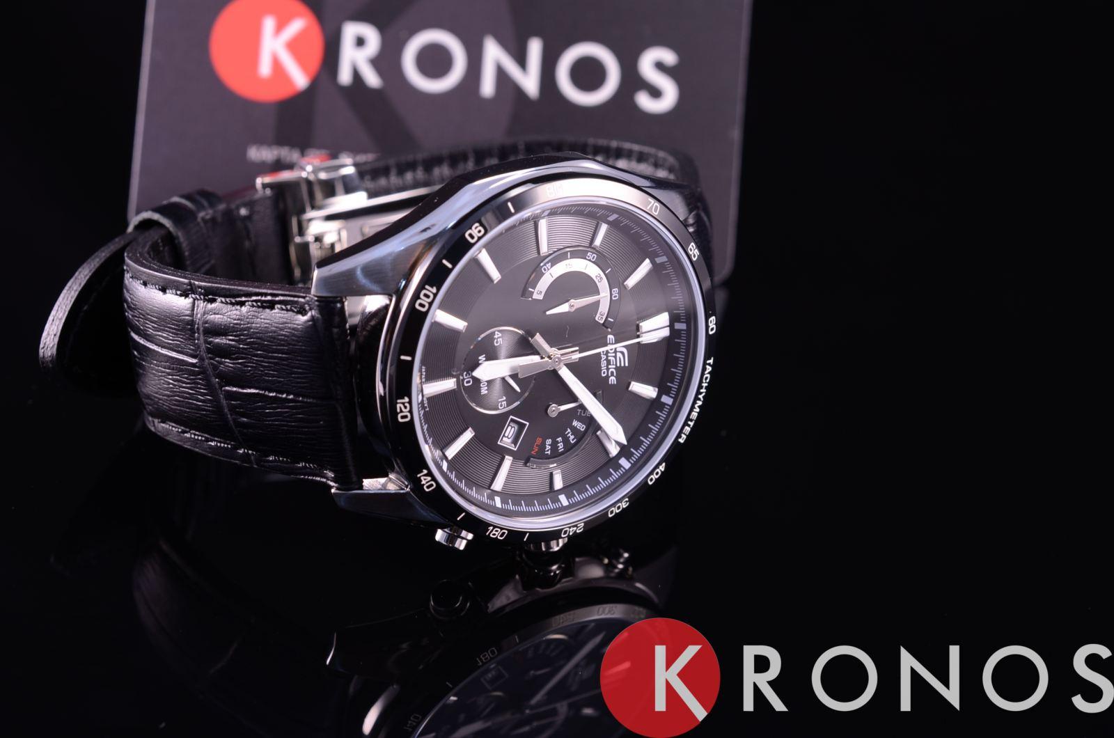 Мужские классические наручные часы Casio Edifice надежные и практичные. Кварцевый японский механизм Miyota. Точность хода не хуже -10 +15 сек./в месяц. Часы оснащены функцией хронографа. Циферблат черног цвета с контрастными индексами.