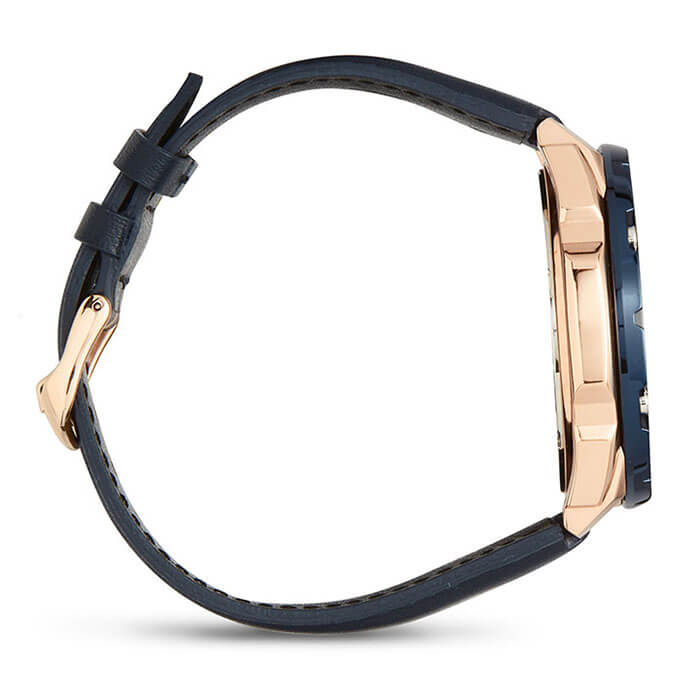 Аналоговый синий циферблат с крупными элементами и счётчиками дополнен массивным стальным безелемБезельВнешний ободок, закрепляющий стекло. В спортивных часах так называется поворотное кольцо с делениями на циферблате, выполняет роль таймера – замеряет отрезки времени на шкале. Неподвижный безель – элемент декора. Однонаправленно вращающийся безель на дайверских часах позволяет фиксировать моменты погружения и выныривания на поверхность. оригинальной формы. Наручные часы дополнены ремешком из натуральной кожи в тон циферблату. Завинчивающаяся задняя крышка и заводная головка способствуют высокой водонепроницаемости при давлении 10 бар. 1 батарейка обеспечивает бесперебойную работу часов в течение 3 лет. Люминесцентная подсветкаЛюминесцентное покрытиеПозволяет считывать показания времени в темноте. Производители наносят на стрелки, часовые индексы, безель или поверхность циферблата светонакопительный состав, дающий холодное свечение.. Секундомер, хронографХронографФункция позволяет измерять отрезки времени с особой точностью: часы, минуты, секунды. Верным признаком хронографа является наличие на циферблате 3 дополнительных окошек-счётчиков., прямоугольное окошко даты. Габариты: 51 x 48,4 x 12,1 мм.