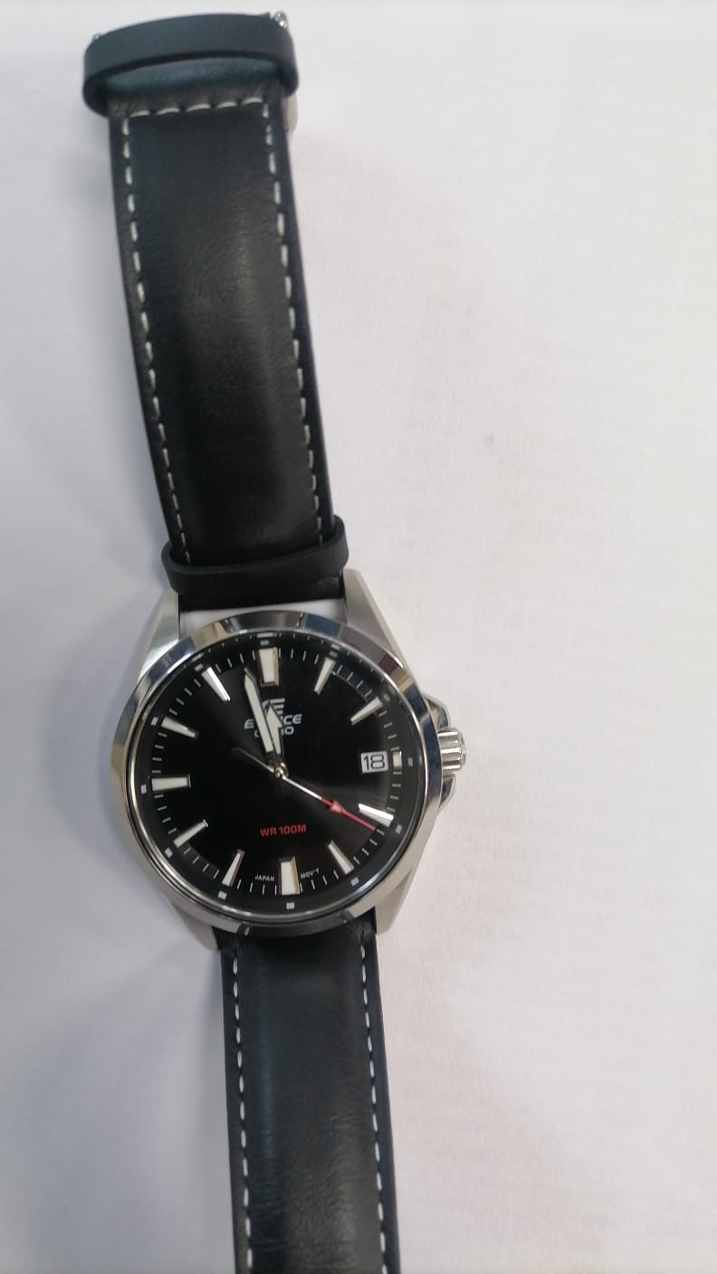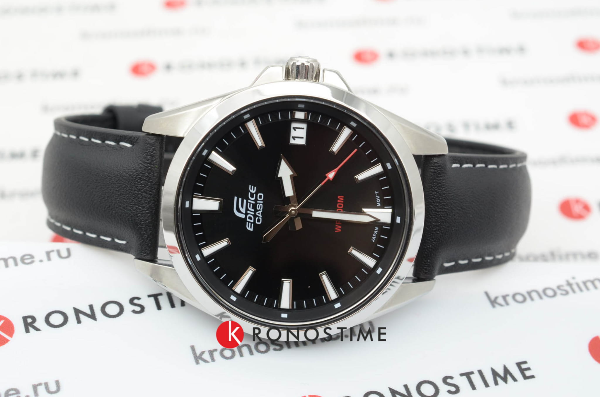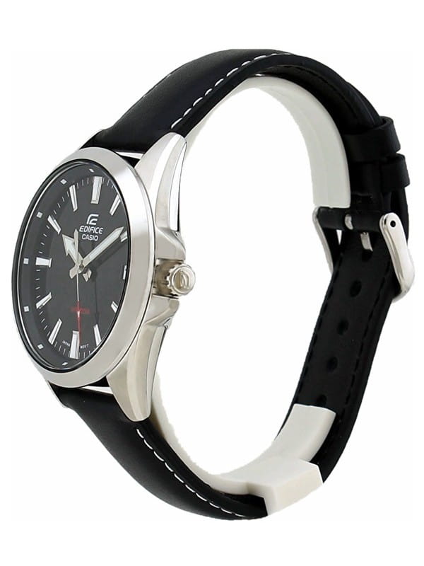 Японские мужские часы-хронографХронографФункция позволяет измерять отрезки времени с особой точностью: часы, минуты, секунды. Верным признаком хронографа является наличие на циферблате 3 дополнительных окошек-счётчиков. Casio Edifice EFV-100L-1A. Edifice — крупный хронограф из серии EFV-550 на ремешке из натуральной кожи в стальном корпусе с черным циферблатом и яркими красными деталями. Модель отличает внушительные размеры и спортивный автомобильный дизайн. Минеральное стеклоМинеральное стеклоМинеральное стекло представляет собой искусственно выращенный минерал кварца. Такое стекло отличается особой устойчивостью к повреждениям и царапинам. Уступает по некоторым качествам сапфировому стеклу. устойчивое к появлению царапин, обладающее высокой прозрачностью. Светодиодная автоподсветка NeobriteПодсветка NeobriteИспользование светонакопительных составов на основе сульфида цинка или алюмината стронция, яркий свет можно наблюдать на протяжении 6-10 часов после «зарядки» часов около источника света. - при повороте часов в сторону лица подсветка дисплея осуществляется автоматически. Настраиваемое послесвечение 1,5 или 3сек. СекундомерСекундомерСекундоме́р — прибор, способный измерять интервалы времени с точностью до долей секунды. с точностью измерения 1/100 секунды и измерением до 23 часов 59 минут 59,99 cек. Класс водозащиты: 100 метров, позволит плавать, нырять и заниматься другими водными видами спорта. Кожаный ремешок на стандартной застежке.