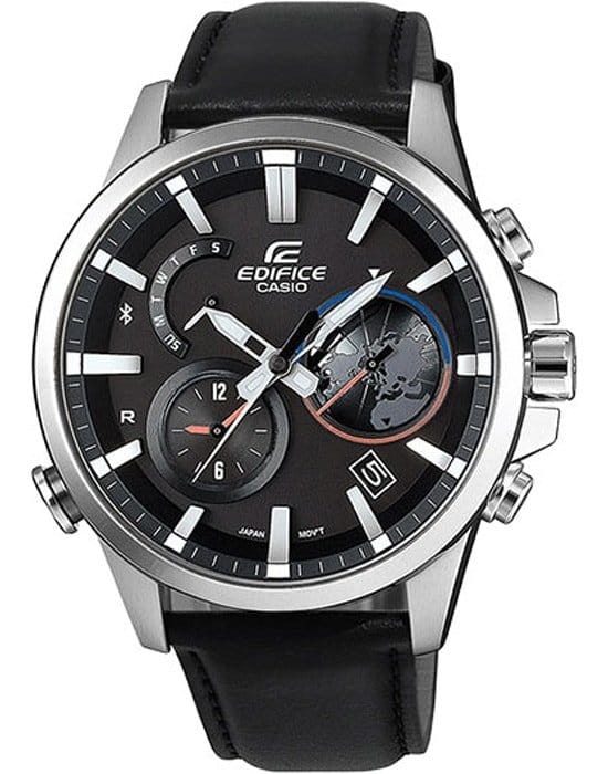 Edifice Smartphone Link. Питание от солнечной энергии Tough Solar - солнечные батарейки большой мощности, индикатор низкого заряда батареи. Функция автоматического сохранения энергии. Время работы аккумулятора без подзарядки приблизительно 5 месяцев, при включенной функции сохранения энергии приблизительно 19 месяцев. Светонакопительное покрытие необрит продолжает светиться в темноте даже после непродолжительного пребывания на свету. Беспроводная технология Bluetooth® 4.0 со сверхнизким потреблением энергии для синхронизации со смартфоном. При подключении к смартфону часы корректируют текущее время, а также копируют настройки мирового времени. Мировое время – 300 городов. Функция включения/отключения летнего времени. Функция поиска телефона. Второй часовой пояс. Индикатор день/ночь. Ретроградный указатель дня недели. Завинчивающаяся заводная головка с защитой.