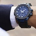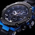 Наручные часы отражают динамичный характер. Необычным элементом стал счётчик у отметки 9 часов, имитирующий турбину. Он помогает контролировать уровень заряда батарейки, чем больше цвета вы видите, тем выше необходимость зарядить модель. Питание осуществляется за счёт солнечной батареи - технология . Также стоит обратить внимание на лёгкий карбоновый безельБезельВнешний ободок, закрепляющий стекло. В спортивных часах так называется поворотное кольцо с делениями на циферблате, выполняет роль таймера – замеряет отрезки времени на шкале. Неподвижный безель – элемент декора. Однонаправленно вращающийся безель на дайверских часах позволяет фиксировать моменты погружения и выныривания на поверхность., снижающий вес модели и усиливающий противоударный корпусУдаропрочный корпусМеханизм заключён в корпус, выполненный из современных материалов, устойчивых к ударам, механическим повреждениям и падению с высоты: инновационный пластик, карбон, нержавеющая сталь, титан. из пластика и стали 316L с синим IP-покрытиемIP-покрытиеМетод ионного напыления. Демонстрирует повышенную устойчивость к истиранию, окислению и химическим веществам. Под воздействием высокого давления и температуры около 1500°C молекулы металла надёжно соединяются с частицами корпуса часов.. Двухслойный полимерный ремешок. Сапфировое стекло. СветодиоднаяСветодиодная подсветкаСветодиодная или LED-подсветка обеспечивает появление яркого холодного свечения за счёт LED-элементов - маленьких лампочек. Они потребляют минимальное количество энергии, чаще всего можно встретить 1 светодиод, в нижней части циферблата. и люминесцентная подсветкаЛюминесцентное покрытиеПозволяет считывать показания времени в темноте. Производители наносят на стрелки, часовые индексы, безель или поверхность циферблата светонакопительный состав, дающий холодное свечение.. Завинчивающаяся заводная головка. Возможности: BluetoothBluetoothСовременная технология, позволяющая синхронизировать часы с телефоном и переносить данные. Часы с Bluetooth расширяют возможности вашего смартфона и делают его использование ещё более удобным., ежедневный будильник, секундомер, хронографХронографФункция позволяет измерять отрезки времени с особой точностью: часы, минуты, секунды. Верным признаком хронографа является наличие на циферблате 3 дополнительных окошек-счётчиков., мировое времяМировое время Полезное часовое усложнение, отображающее время в основных городах и известных областях по всему миру, оно связано с часовыми поясами, удобно для путешественников и бизнесменов. , автоматический календарь, таймер. Габариты: 58,1 x 53,8 x 14,1 мм.