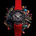 Брендовая модель серии G-Steel представлена в оригинальном исполнении, дизайнеры акцентировали внимание на внушительном безелеБезельВнешний ободок, закрепляющий стекло. В спортивных часах так называется поворотное кольцо с делениями на циферблате, выполняет роль таймера – замеряет отрезки времени на шкале. Неподвижный безель – элемент декора. Однонаправленно вращающийся безель на дайверских часах позволяет фиксировать моменты погружения и выныривания на поверхность. с IP-покрытиемIP-покрытиеМетод ионного напыления. Демонстрирует повышенную устойчивость к истиранию, окислению и химическим веществам. Под воздействием высокого давления и температуры около 1500°C молекулы металла надёжно соединяются с частицами корпуса часов.. Стильным дополнением стал красный каучуковый ремешок, обеспечивающий комфортное ношение. Это часы на солнечной батарее , позволяющие забыть о необходимости завода. Люминесцентная подсветкаЛюминесцентное покрытиеПозволяет считывать показания времени в темноте. Производители наносят на стрелки, часовые индексы, безель или поверхность циферблата светонакопительный состав, дающий холодное свечение. стрелок, яркая светодиодная подсветкаСветодиодная подсветкаСветодиодная или LED-подсветка обеспечивает появление яркого холодного свечения за счёт LED-элементов - маленьких лампочек. Они потребляют минимальное количество энергии, чаще всего можно встретить 1 светодиод, в нижней части циферблата. дисплея. Ударопрочный корпусУдаропрочный корпусМеханизм заключён в корпус, выполненный из современных материалов, устойчивых к ударам, механическим повреждениям и падению с высоты: инновационный пластик, карбон, нержавеющая сталь, титан. из пластика и хирургической стали 316L. Водостойкость 20 бар. Таймер, секундомер, будильник, мировое времяМировое время Полезное часовое усложнение, отображающее время в основных городах и известных областях по всему миру, оно связано с часовыми поясами, удобно для путешественников и бизнесменов. , автоматический календарь, приём радиосигнала для корректировки времени, хронографХронографФункция позволяет измерять отрезки времени с особой точностью: часы, минуты, секунды. Верным признаком хронографа является наличие на циферблате 3 дополнительных окошек-счётчиков.. Габариты: 55,9 x 49,3 x 15,3 мм.