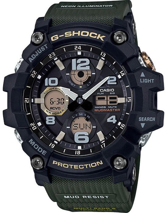 Наручные часы относятся к линейке Mudmaster, массивная модель с крупными деталями на вашем запястье точно не останется незамеченной. Ключевой особенностью стал герметичный ударопрочный корпусУдаропрочный корпусМеханизм заключён в корпус, выполненный из современных материалов, устойчивых к ударам, механическим повреждениям и падению с высоты: инновационный пластик, карбон, нержавеющая сталь, титан., способный препятствовать попаданию внутрь пыли, песка и грязи. Также ему не страшны вибрации, падение и удары. Это часы на солнечной батарее с технологией , время работы батарейки без подзарядки составляет 7 месяцев. Специальный индикатор позволяет следить за уровнем зарядки. Минеральное стекло. Двойная светодиодная подсветкаСветодиодная подсветкаСветодиодная или LED-подсветка обеспечивает появление яркого холодного свечения за счёт LED-элементов - маленьких лампочек. Они потребляют минимальное количество энергии, чаще всего можно встретить 1 светодиод, в нижней части циферблата. ЖК-дисплея и циферблата. Удобный полимерный ремешок защитного цвета хаки. Стрелки с люминесцентной подсветкойЛюминесцентное покрытиеПозволяет считывать показания времени в темноте. Производители наносят на стрелки, часовые индексы, безель или поверхность циферблата светонакопительный состав, дающий холодное свечение.. Водостойкость 20 бар. Коррекция времени по радиосигналу, функция мирового времениМировое время Полезное часовое усложнение, отображающее время в основных городах и известных областях по всему миру, оно связано с часовыми поясами, удобно для путешественников и бизнесменов. , автоматический календарь, будильник, таймер, секундомер. Габариты: 56,2 x 54,9 x 17,3 мм.