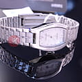Элегантная модель от Casio отличается привлекательным и удобным дизайном. Выпуклый по бокам корпус выполнен из гипоаллергенной латуни. На светло-серебристом циферблате расположены временные отметки, сделанные в виде штрихов и арабских цифр. Гладкий, серебристый браслет сделан из нержавеющей стали и включает в себя складную застежку. Часы работают от батарейки, срок службы которой составляет 3 года. Вес аксессуара равен 48 граммам.