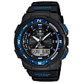 Многофункциональные часы круглой формы с аналогово-цифровым циферблатом черного цвета, обрамленным алюминиевым безелем цвета ночного неба. Черно-синий пластиковый корпус удерживается на руке черным пластиковым браслетом. Часы Casio SGW-500H-2B имеют светодиодную подсветку, встроенный цифровой компас, отображение возраста и фазы Луны, времени восхода и захода солнца, температурным датчиком, 5 будильниками и автоматическим календарем, указывающим число, день недели, месяц и год. Корпус - Алюминий; Стекло - Пластик; Водозащита - 100 м. (WR 100); Материал ремешка - Пластиковый; Цвет ремешка - Черный; Цвет циферблата - Черный.