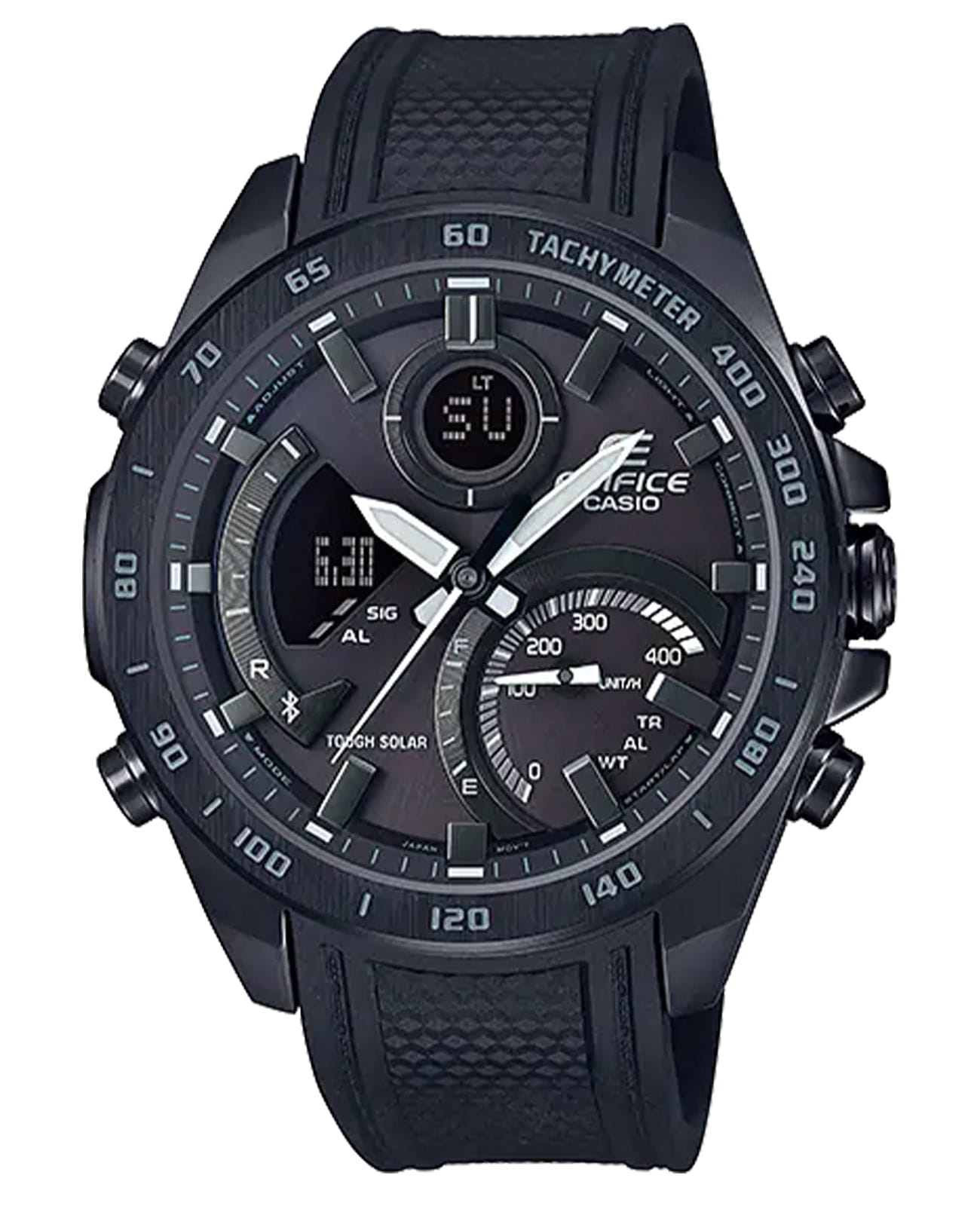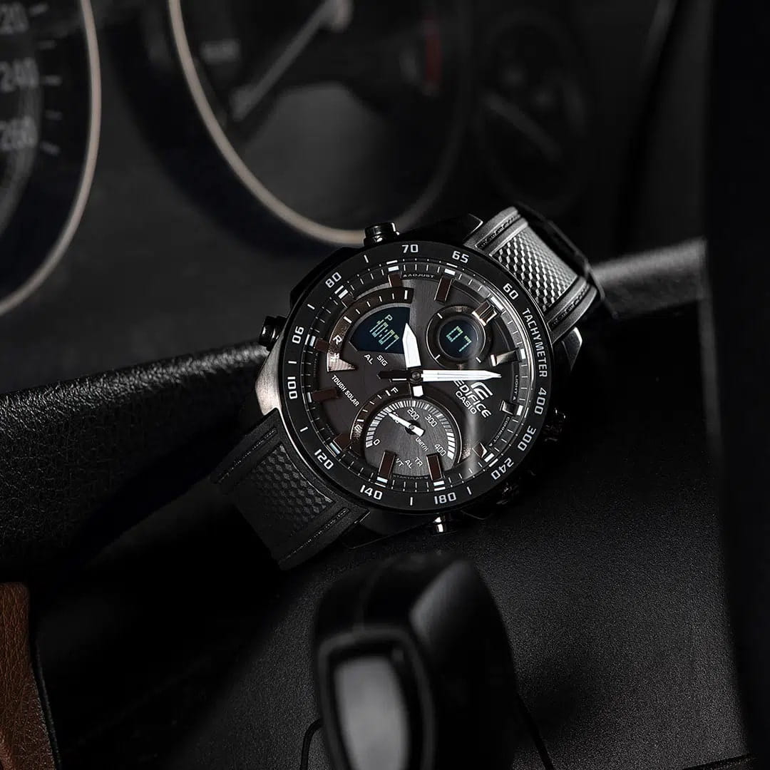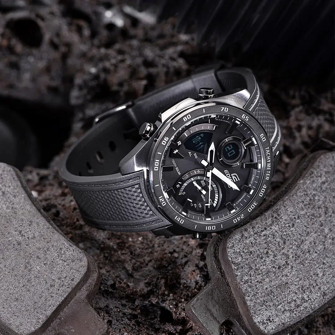Многофункциональные мужские часы с с минеральным стекломМинеральное стеклоМинеральное стекло представляет собой искусственно выращенный минерал кварца. Такое стекло отличается особой устойчивостью к повреждениям и царапинам. Уступает по некоторым качествам сапфировому стеклу. Casio Edifice ECB-900PB-1A, кварцевый механизм с высокой точностью. Класс водозащиты: 100 метров, позволит плавать, нырять и заниматься другими водными видами спорта. Корпус часов изготовлен из стали с IP-покрытиемIP-покрытиеМетод ионного напыления. Демонстрирует повышенную устойчивость к истиранию, окислению и химическим веществам. Под воздействием высокого давления и температуры около 1500°C молекулы металла надёжно соединяются с частицами корпуса часов.. Питание от солнечной энергии Tough SolarTough SolarТехнология основана на подзарядке аккумулятора от источника солнечного света, специальная панель улавливает солнечные лучи и преобразует их в энергию для работы часов. Достаточно пары минут нахождения на солнце для функционирования часов в течении суток. - высокоэффективная солнечная батарея, аккумулятор, индикатор низкого заряда батареи. Функция автоматического сохранения энергии. Время работы аккумулятора без подзарядки приблизительно 6 месяцев, при включенной функции сохранения энергии приблизительно 19 месяцев. Двойная подсветка Super Illuminator с функцией Afterglow (для подсветки не нужно удерживать кнопку, время послесвечения настраивается 1,5 или 3 сек): одновременно подсвечивается аналоговый циферблат и цифровой дисплей. Цвет подсветки: белый. Подсветка NeobriteПодсветка NeobriteИспользование светонакопительных составов на основе сульфида цинка или алюмината стронция, яркий свет можно наблюдать на протяжении 6-10 часов после «зарядки» часов около источника света. обеспечивает длительное послесвечение в темноте даже после кратковременного нахождения на свету. Сплит-хронографСплит-хронографИспользуется для измерения продолжительности нескольких временных отрезков, начинающихся одновременно, а заканчивающихся в разное время. с тахиметромТахиметрРазмеченная шкала, располагается на ободке или безеле часов. Тахиметр позволяет рассчитать скорость на определённом участке пути, расстояние измеряется в километрах или милях.. Мировое время Мировое время Полезное часовое усложнение, отображающее время в основных городах и известных областях по всему миру, оно связано с часовыми поясами, удобно для путешественников и бизнесменов. – 39 городов (39 часовых поясов). Функция включения/отключения летнего времени. СекундомерСекундомерСекундоме́р — прибор, способный измерять интервалы времени с точностью до долей секунды. с разрешениями показаний: 1/1000 сек (до 1 ч) и 1/10 сек (после 1 ч) и временем измерения 24 ч. ТаймерТаймерОтсчитывает секунды в обратном направлении в заданном интервале времени. обратного отсчета от 1 сек до 24 ч. 12-ти и 24-х часовой формат времени. Беспроводная технология Bluetooth со сверхнизким потреблением энергии для синхронизации со смартфоном. При подключении к смартфону часы автоматически корректируют текущее время, в том числе переход на зимнее/летнее время, копируют настройки мирового времени более чем для 300 городов, оповещают при поступлении звонка на мобильный телефон. Функция поиска телефона, настройка таймера и будильника. Приложение EDIFICE Connected позвол