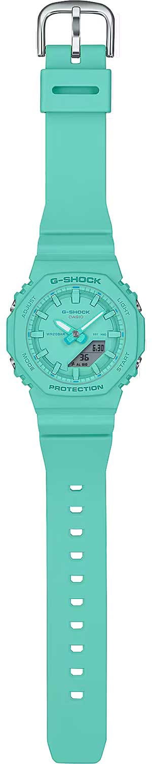 Женские кварцевые часы Casio G-Shock Casio G-Shock GMA-P2100-2A. Корпус часов изготовлен из пластика. Стрелки с люминесцентным покрытиемЛюминесцентное покрытиеПозволяет считывать показания времени в темноте. Производители наносят на стрелки, часовые индексы, безель или поверхность циферблата светонакопительный состав, дающий холодное свечение.. Водозащита: 200 метров, позволит плавать, нырять и заниматься другими водными видами спорта. Минеральное стеклоМинеральное стеклоМинеральное стекло представляет собой искусственно выращенный минерал кварца. Такое стекло отличается особой устойчивостью к повреждениям и царапинам. Уступает по некоторым качествам сапфировому стеклу. устойчивое к появлению царапин, обладающее высокой прозрачностью. Необритовое светонакопительное покрытие обеспечивает длительное послесвечение в темноте даже после кратковременного нахождения на свету. 12-ти и 24-х часовой формат времени. СекундомерСекундомерСекундоме́р — прибор, способный измерять интервалы времени с точностью до долей секунды. с двумя точностями показаний: 1/100с (до 1ч) и 1с (после 1ч) и временем измерения 24ч. Сплит-хронографСплит-хронографИспользуется для измерения продолжительности нескольких временных отрезков, начинающихся одновременно, а заканчивающихся в разное время.. ТаймерТаймерОтсчитывает секунды в обратном направлении в заданном интервале времени. обратного отсчета от 1с до 24ч. Мировое время – 48 городов (31 часовой пояс), всемирное координированное время (UTC). Пластиковый ремешок с классической застежкой.