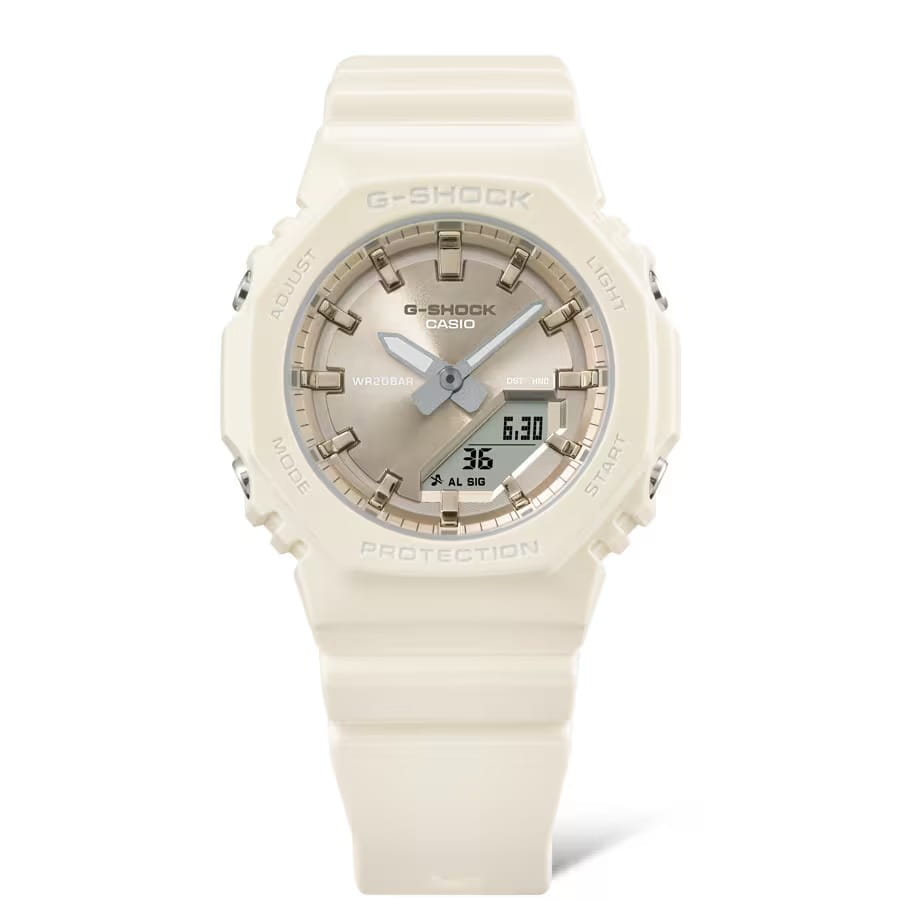 Женские кварцевые часы Casio G-Shock GMA-P2100ST-7A. Корпус часов изготовлен из пластика. Стрелки с люминесцентным покрытиемЛюминесцентное покрытиеПозволяет считывать показания времени в темноте. Производители наносят на стрелки, часовые индексы, безель или поверхность циферблата светонакопительный состав, дающий холодное свечение.. Водозащита: 200 метров, позволит плавать, нырять и заниматься другими водными видами спорта. Минеральное стеклоМинеральное стеклоМинеральное стекло представляет собой искусственно выращенный минерал кварца. Такое стекло отличается особой устойчивостью к повреждениям и царапинам. Уступает по некоторым качествам сапфировому стеклу. устойчивое к появлению царапин, обладающее высокой прозрачностью.