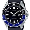 Японские мужские кварцевые часы с минеральным стекломМинеральное стеклоМинеральное стекло представляет собой искусственно выращенный минерал кварца. Такое стекло отличается особой устойчивостью к повреждениям и царапинам. Уступает по некоторым качествам сапфировому стеклу. Casio Collection MDV-107-1A2, кварцевый механизм с высокой точностью. Корпус часов изготовлен из нержавеющей стали. Вращающийся безельБезельВнешний ободок, закрепляющий стекло. В спортивных часах так называется поворотное кольцо с делениями на циферблате, выполняет роль таймера – замеряет отрезки времени на шкале. Неподвижный безель – элемент декора. Однонаправленно вращающийся безель на дайверских часах позволяет фиксировать моменты погружения и выныривания на поверхность. из нержавеющей стали с IP-покрытиемIP-покрытиеМетод ионного напыления. Демонстрирует повышенную устойчивость к истиранию, окислению и химическим веществам. Под воздействием высокого давления и температуры около 1500°C молекулы металла надёжно соединяются с частицами корпуса часов.. Стрелки  с люминесцентным покрытиемЛюминесцентное покрытиеПозволяет считывать показания времени в темноте. Производители наносят на стрелки, часовые индексы, безель или поверхность циферблата светонакопительный состав, дающий холодное свечение.. Окошко даты находится в положении 3 часа. Класс водозащиты: 200 метров, позволит плавать, нырять и заниматься другими водными видами спорта. Ремешок с классической застежкой.