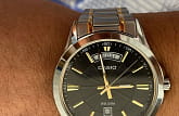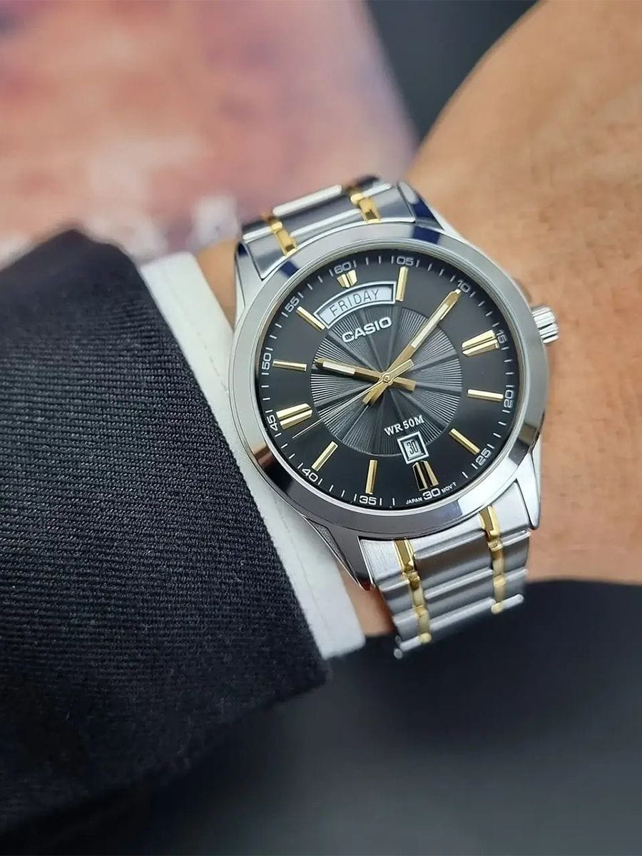 Японские мужские наручные часы с минеральным стекломМинеральное стеклоМинеральное стекло представляет собой искусственно выращенный минерал кварца. Такое стекло отличается особой устойчивостью к повреждениям и царапинам. Уступает по некоторым качествам сапфировому стеклу. Casio MTP-1381G-1A, кварцевый механизм с высокой точностью. Класс водозащиты: 50 метров, позволит защитить корпус от случайных брызг или капель дождя. Корпус часов изготовлен из стали. Стальной браслет на раскладной застёжкеРаскладная застёжкаТакой тип застёжки используется только на браслетах из металла. Она никогда не раскрывается полностью, происходит разделение на 2 и более частей. Раскладывающая застёжка снизит вероятность потери часов к минимуму. с IP-покрытиемIP-покрытиеМетод ионного напыления. Демонстрирует повышенную устойчивость к истиранию, окислению и химическим веществам. Под воздействием высокого давления и температуры около 1500°C молекулы металла надёжно соединяются с частицами корпуса часов.. Окошко даты находится в положении 6 часов.