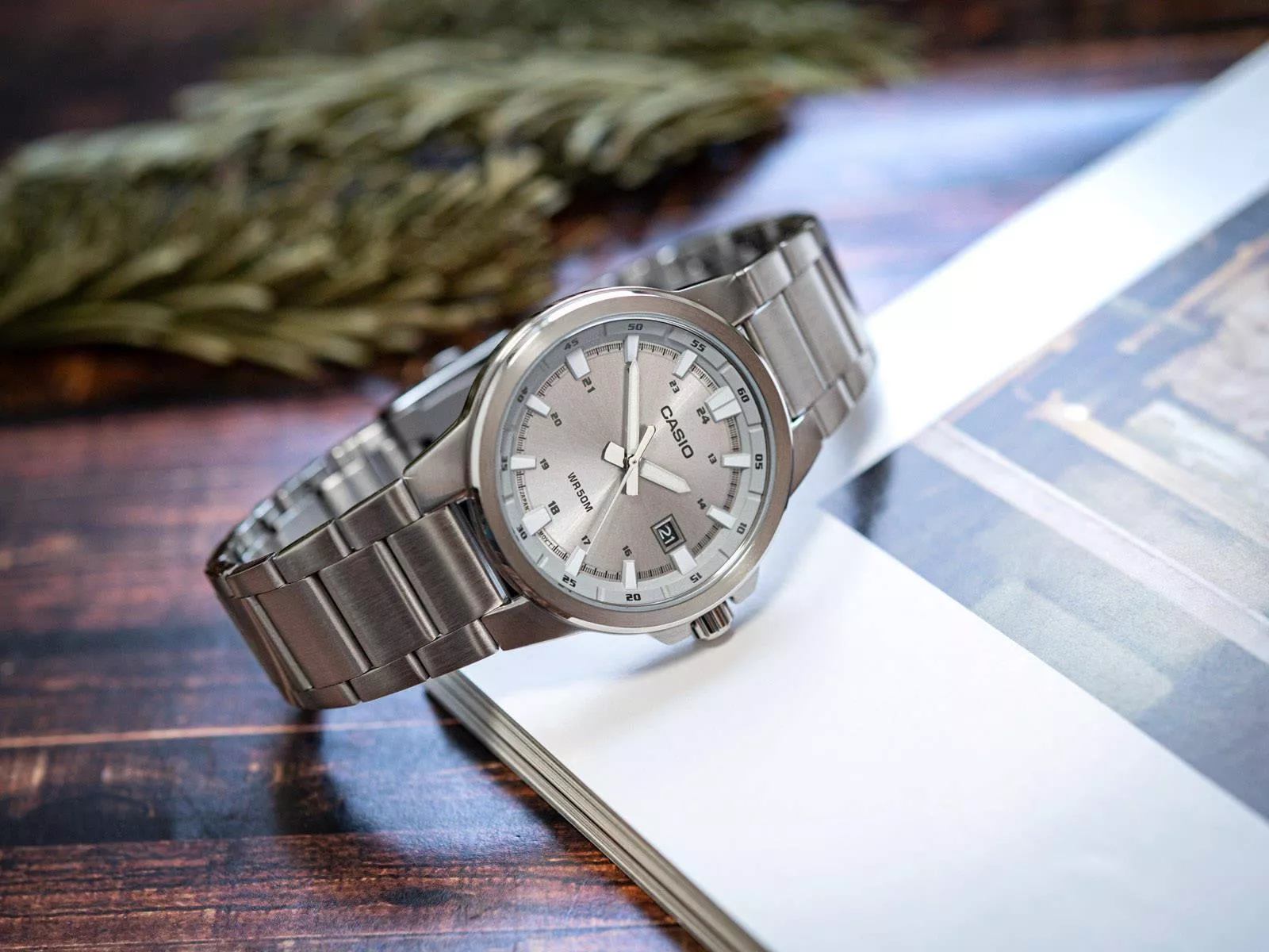 Японские мужские наручные часы с минеральным стекломМинеральное стеклоМинеральное стекло представляет собой искусственно выращенный минерал кварца. Такое стекло отличается особой устойчивостью к повреждениям и царапинам. Уступает по некоторым качествам сапфировому стеклу. Casio Collection MTP-E173D-7A, кварцевый механизм с высокой точностью. Окошко даты с увеличительным стеклом. Класс водозащиты: 50 метров, позволит защитить корпус от случайных брызг или капель дождя. Корпус часов изготовлен из стали. Стальной браслет на раскладной застёжкеРаскладная застёжкаТакой тип застёжки используется только на браслетах из металла. Она никогда не раскрывается полностью, происходит разделение на 2 и более частей. Раскладывающая застёжка снизит вероятность потери часов к минимуму.. Стрелки и метки с люминесцентным покрытиемЛюминесцентное покрытиеПозволяет считывать показания времени в темноте. Производители наносят на стрелки, часовые индексы, безель или поверхность циферблата светонакопительный состав, дающий холодное свечение..