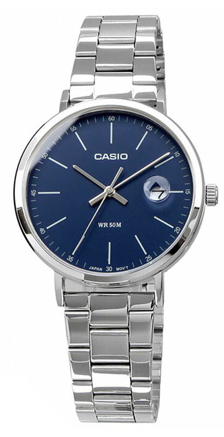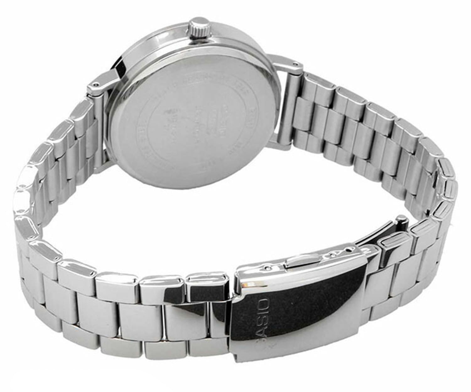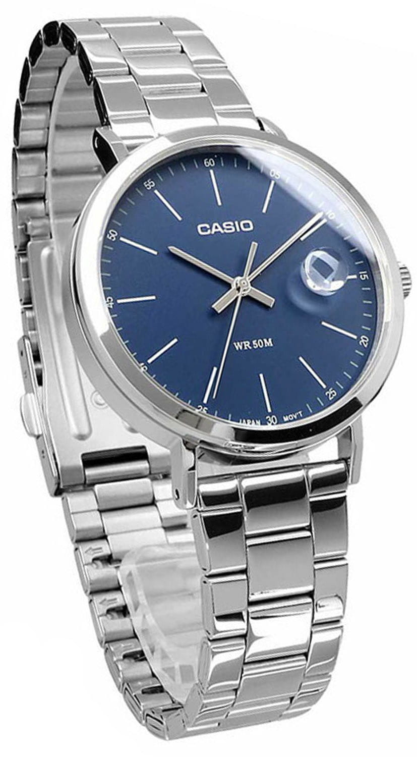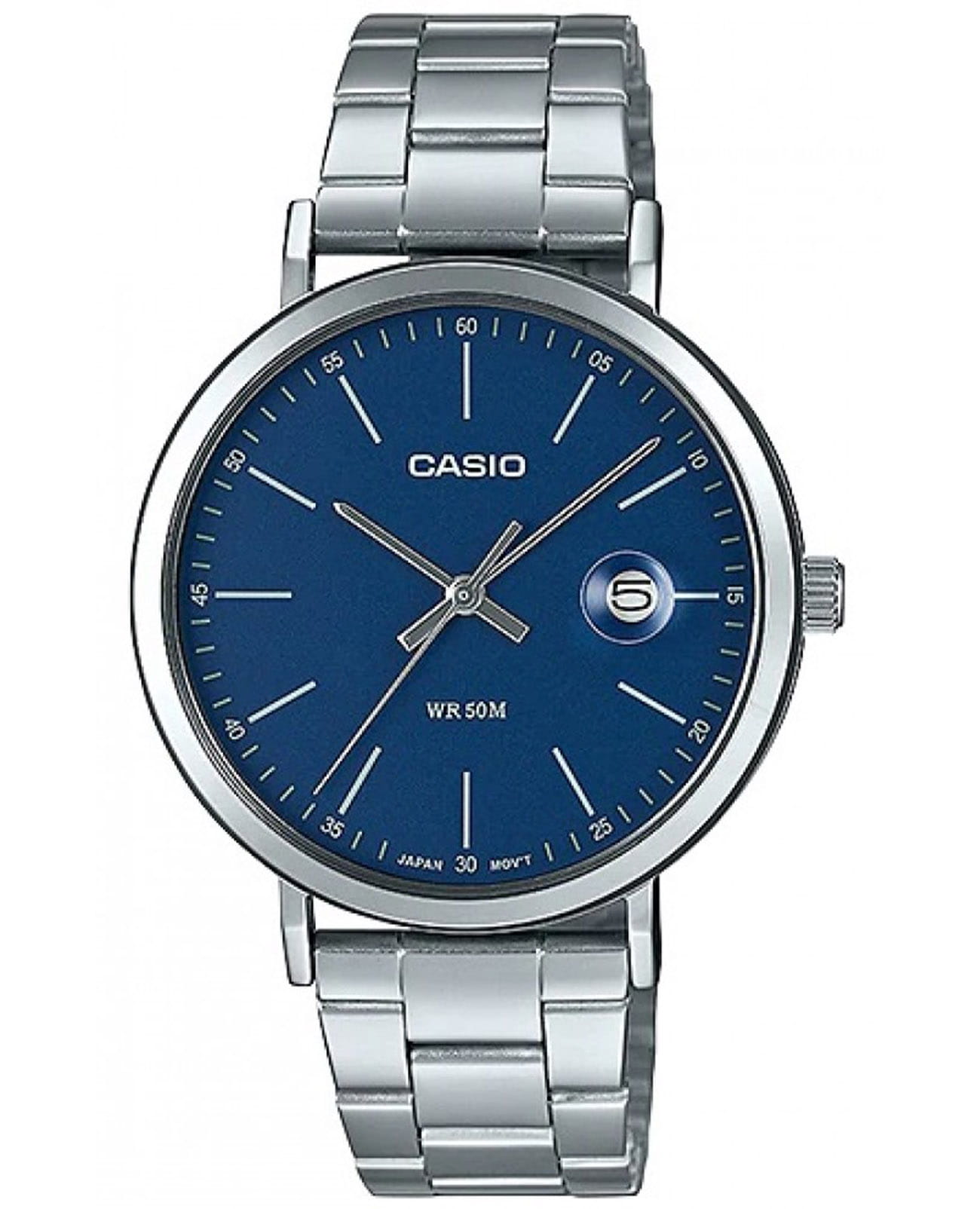 Японские мужские наручные часы с минеральным стекломМинеральное стеклоМинеральное стекло представляет собой искусственно выращенный минерал кварца. Такое стекло отличается особой устойчивостью к повреждениям и царапинам. Уступает по некоторым качествам сапфировому стеклу. Casio Collection MTP-E175D-2E, кварцевый механизм с высокой точностью. Окошко даты с увеличительным стеклом. Класс водозащиты: 50 метров, позволит защитить корпус от случайных брызг или капель дождя. Корпус часов изготовлен из стали. Стальной браслет на раскладной застёжкеРаскладная застёжкаТакой тип застёжки используется только на браслетах из металла. Она никогда не раскрывается полностью, происходит разделение на 2 и более частей. Раскладывающая застёжка снизит вероятность потери часов к минимуму..