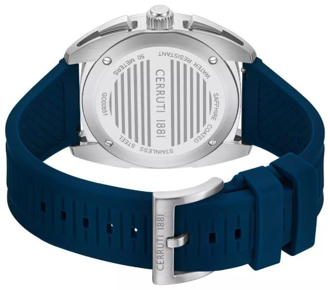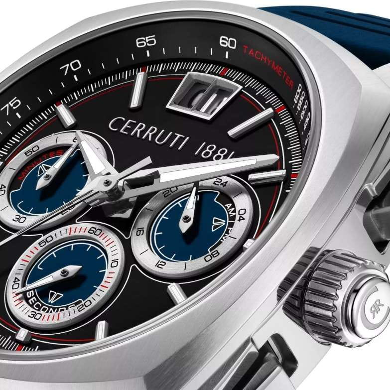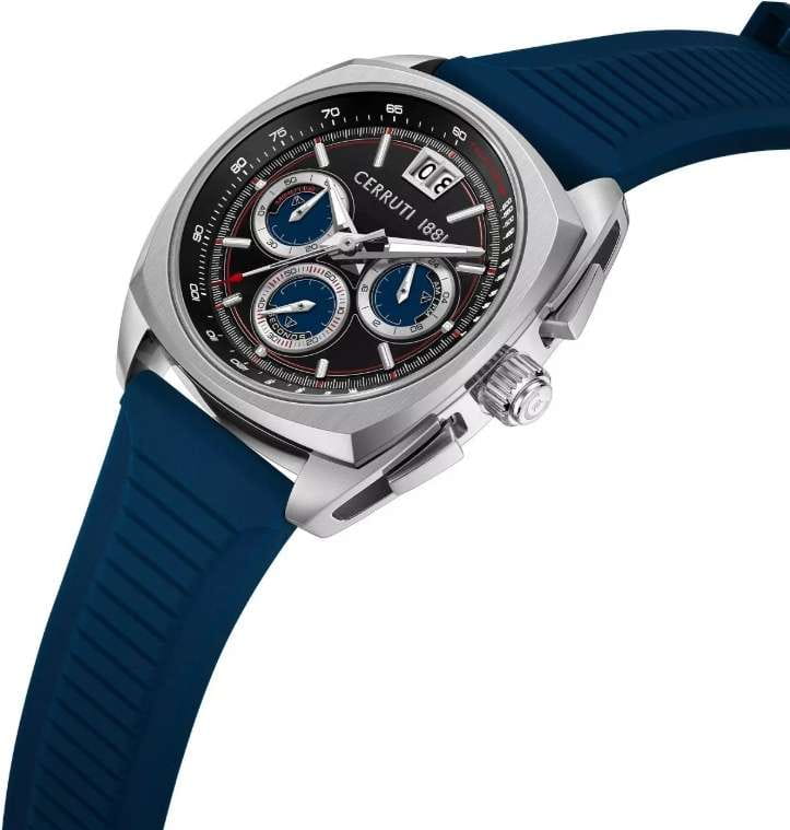 Мужские кварцевые часы Cerruti 1881 Cuneo CIWGO0085105 — спортивный аксессуар с французским дизайном и расширенным функционалом. Корпус из нержавеющей стали 316L, размером 41.3 мм. Циферблат — чёрный с синими элементами, с штриховыми метками и окошком даты в положении 12 часов. Стекло — минеральноеМинеральное стеклоМинеральное стекло представляет собой искусственно выращенный минерал кварца. Такое стекло отличается особой устойчивостью к повреждениям и царапинам. Уступает по некоторым качествам сапфировому стеклу. с сапфировым покрытием. Стрелки и метки с люминесцентным покрытиемЛюминесцентное покрытиеПозволяет считывать показания времени в темноте. Производители наносят на стрелки, часовые индексы, безель или поверхность циферблата светонакопительный состав, дающий холодное свечение.. Функции: хронографХронографФункция позволяет измерять отрезки времени с особой точностью: часы, минуты, секунды. Верным признаком хронографа является наличие на циферблате 3 дополнительных окошек-счётчиков., тахиметрТахиметрРазмеченная шкала, располагается на ободке или безеле часов. Тахиметр позволяет рассчитать скорость на определённом участке пути, расстояние измеряется в километрах или милях., секундомер. Ремешок — синий силиконовый на стандартной застёжке. Водонепроницаемость 100 м. Идеальный выбор для тех, кто ценит французский дизайн и спортивный стиль.