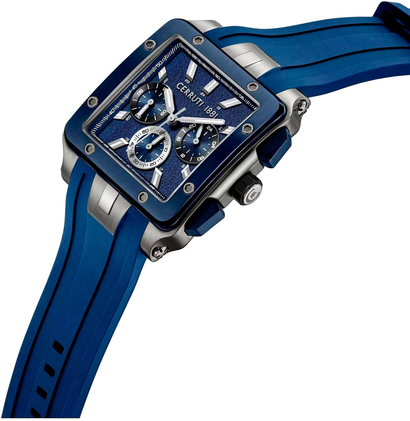 Мужские кварцевые часы Cerruti 1881 Odissea Master CIWGQ0084903 — массивный и функциональный аксессуар в квадратном корпусе с итальянским характером. Корпус из нержавеющей стали 316L с PVD-покрытиемPVDУльтратонкое покрытие наносится в технике вакуумного напыления, сочетает в себе нитрид титана особой прочности со слоем золота или оксида хрома. Несёт в себе декоративную или защитную функцию., размером 40 мм, сочетает матовую и полированную отделку. Циферблат — синий, матовый зернистый, с фирменным логотипом и штриховыми накладными метками. Поддержка 12/24-часового формата времени. Функция хронографаХронографФункция позволяет измерять отрезки времени с особой точностью: часы, минуты, секунды. Верным признаком хронографа является наличие на циферблате 3 дополнительных окошек-счётчиков. дополняется декоративным накладным безелемБезельВнешний ободок, закрепляющий стекло. В спортивных часах так называется поворотное кольцо с делениями на циферблате, выполняет роль таймера – замеряет отрезки времени на шкале. Неподвижный безель – элемент декора. Однонаправленно вращающийся безель на дайверских часах позволяет фиксировать моменты погружения и выныривания на поверхность. с болтами. Стрелки в стиле Baton и метки с люминесцентным покрытиемЛюминесцентное покрытиеПозволяет считывать показания времени в темноте. Производители наносят на стрелки, часовые индексы, безель или поверхность циферблата светонакопительный состав, дающий холодное свечение.. Стекло — минеральноеМинеральное стеклоМинеральное стекло представляет собой искусственно выращенный минерал кварца. Такое стекло отличается особой устойчивостью к повреждениям и царапинам. Уступает по некоторым качествам сапфировому стеклу. с сапфировым покрытием. Ремешок — силиконовый на стандартной застёжке. Водонепроницаемость 50 м. Идеальный выбор для тех, кто ценит итальянский дизайн и спортивную функциональность.