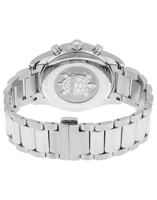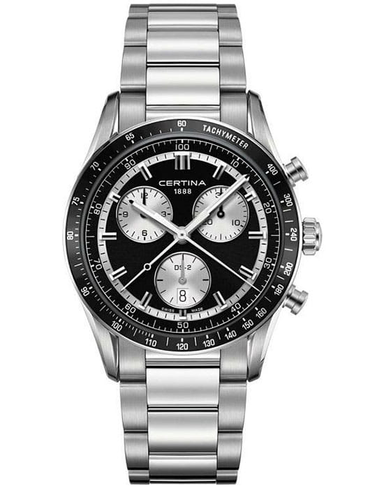 Брендовый аксессуар сразу притягивает внимание. Циферблат «panda-style», дополненный контрастными элементами и функциональными окошками, отражает спортивную динамичность. Алюминиевый безельБезельВнешний ободок, закрепляющий стекло. В спортивных часах так называется поворотное кольцо с делениями на циферблате, выполняет роль таймера – замеряет отрезки времени на шкале. Неподвижный безель – элемент декора. Однонаправленно вращающийся безель на дайверских часах позволяет фиксировать моменты погружения и выныривания на поверхность. размечен шкалой тахиметраТахиметрРазмеченная шкала, располагается на ободке или безеле часов. Тахиметр позволяет рассчитать скорость на определённом участке пути, расстояние измеряется в километрах или милях.. Часы основаны на концепции Double SecurityDS ConceptDouble Security Concept, обозначает двойную надёжность и безупречную точность часов Certina. Двойная система защиты подразумевает обеспечение максимальной устойчивости к ударам и высоких показателей водонепроницаемости., что свидетельствует о высокой устойчивости к ударам и водонепроницаемости (до 10 бар) модели. Швейцарский кварцевый калибр ETA 251.264 Precidrive™Precidrive™Инновационный кварцевый механизм Certina. Часы, оснащённые этим швейцарским калибром, приравниваются к точности к сертифицированным хронометрам, точность хода составляет +/-10 секунд в год., измеряющий время с точностью до одной сотой секунды. Двухстороннее антибликовое покрытие для стекла из сапфира. Корпус и браслет из стали 316L с антикоррозионными свойствами. Задняя крышка с фирменной гравировкой. ХронографХронографФункция позволяет измерять отрезки времени с особой точностью: часы, минуты, секунды. Верным признаком хронографа является наличие на циферблате 3 дополнительных окошек-счётчиков., календарь, индикатор EOLEOLПредставляет собой систему, уведомляющую владельца часов о необходимости замены элемента питания. За 2 недели до полного разряда батарейки секундная стрелка перестаёт ходить чётко и начинает перепрыгивать на 3-4 деления., секундомер. Диаметр корпуса: 41 мм.